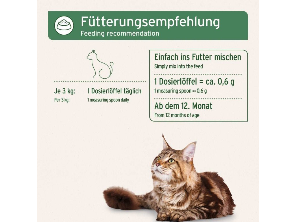 Vitamín B obsažený v pivovarských kvasnicích podporuje celkový metabolismus a přispívá ke zdravé a lesklé srsti. Taurin je na druhé straně základní živinou pro kočky, kterou nelze syntetizovat v dostatečném množství (proto je potřeba dodat jej externě v doplňku krmiva). Dlouhodobý nedostatek taurinu může vést k degeneraci sítnice – onemocnění sítnice, které způsobuje nevratné poškození. Taurin má rovněž pozitivní vliv na řadu metabolických a orgánových funkcí. Omega-3 rybí moučka může mít na druhou stranu pozitivní vliv na úroveň aktivity vaší kočky.