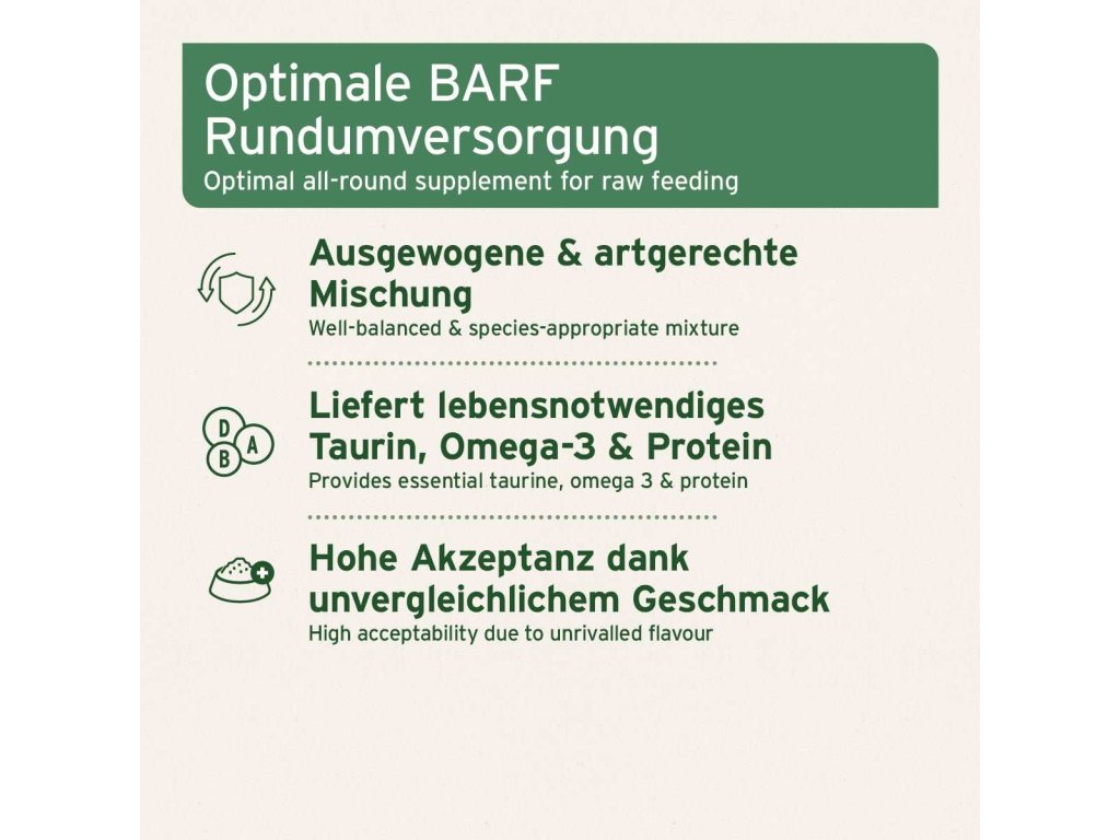 Produkt se skládá z vysoce kvalitních a přírodních surovin a také taurinu, který je pro kočky nezbytný. Nejen díky tomu je ideálním doplňkem pro BARF.