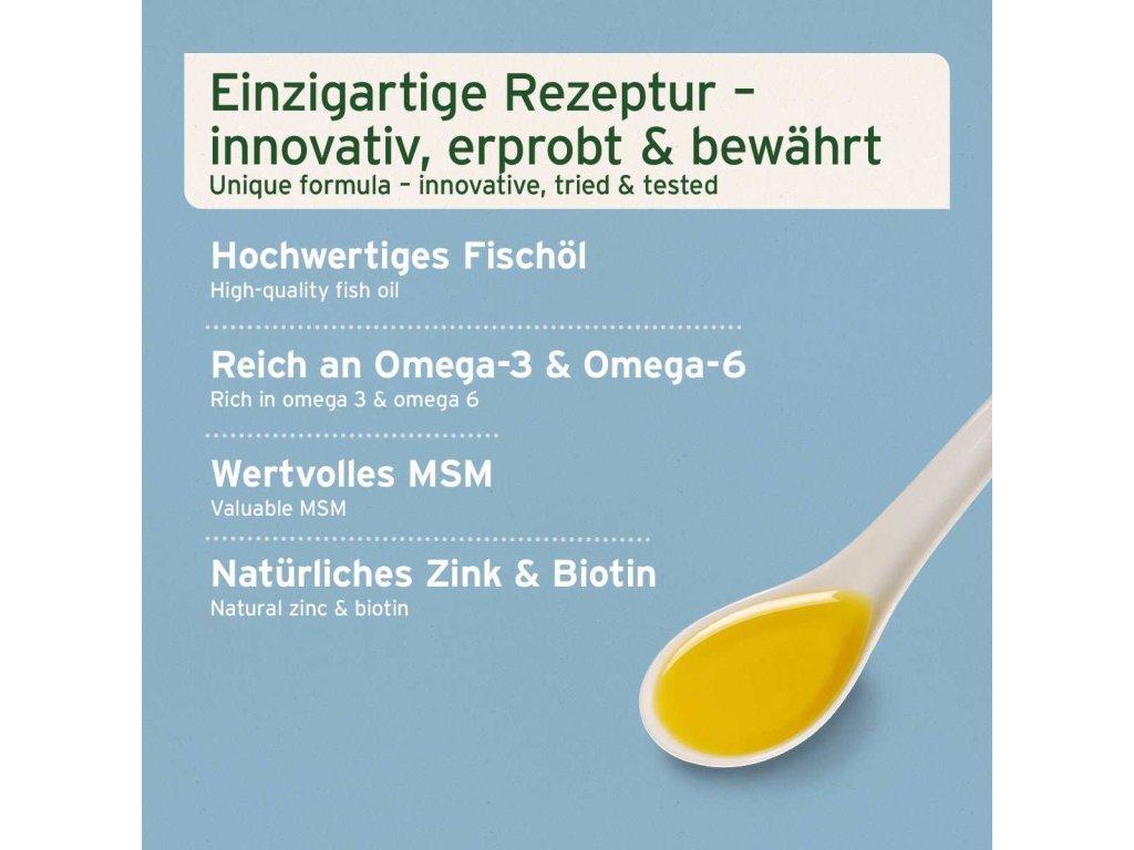 AniForte® Plus Coat & Skin obsahuje přírodní zinek a biotin. Polynenasycené mastné kyseliny z vysoce kvalitního rybího tuku a užitečný přídavek MSM jsou další vysoce kvalitní složky v našem nově vyvinutém přípravku pro lesklou srst a vitální kůži vašeho mazlíčka.