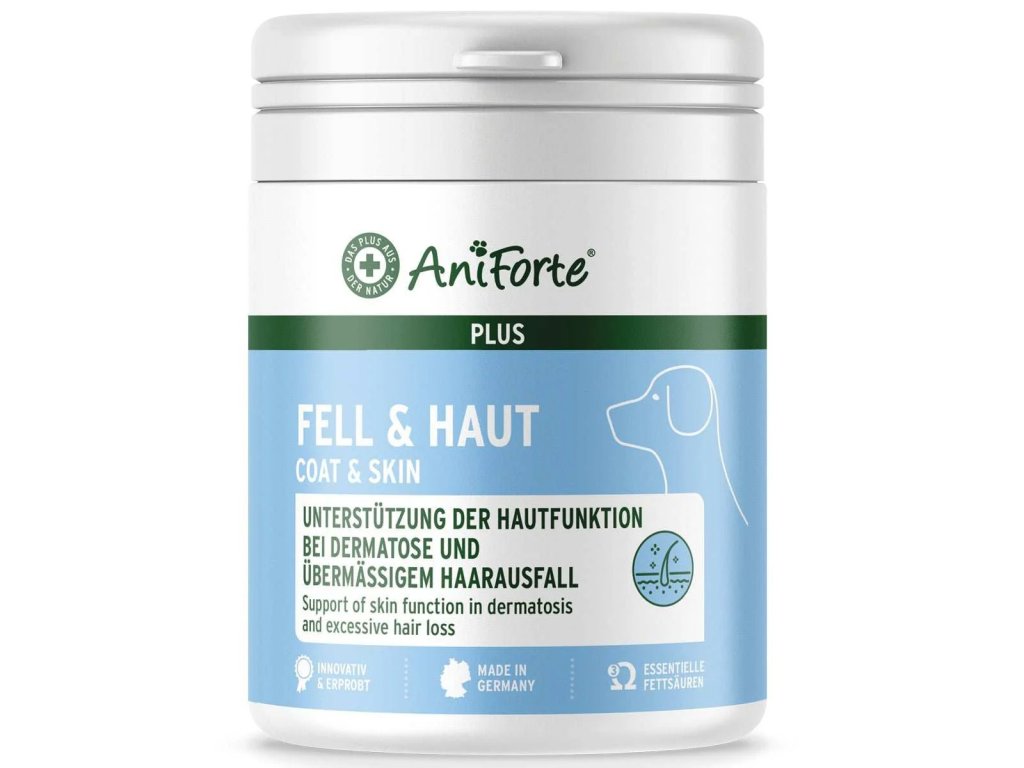 AniForte® Plus Coat & skin je speciální doplněk stravy pro psy. Dietetické krmivo je krmivem pro specifické nutriční účely zvířat trpících zdravotními poruchami, podvýživou nebo příznaky nějakého dočasného nedostatku. Podporují také změnu jídelníčku po nemoci pro stabilizaci zdraví vašeho čtyřnohého kamaráda. AniForte® Plus Srst a kůže byl speciálně vyvinut pro podporu funkce kůže při dermatóze a nadměrném vypadávání chlupů. Jeho speciální složení z něj dělá ideální doplněk pro regulaci zdraví kůže a srsti vašeho psa.