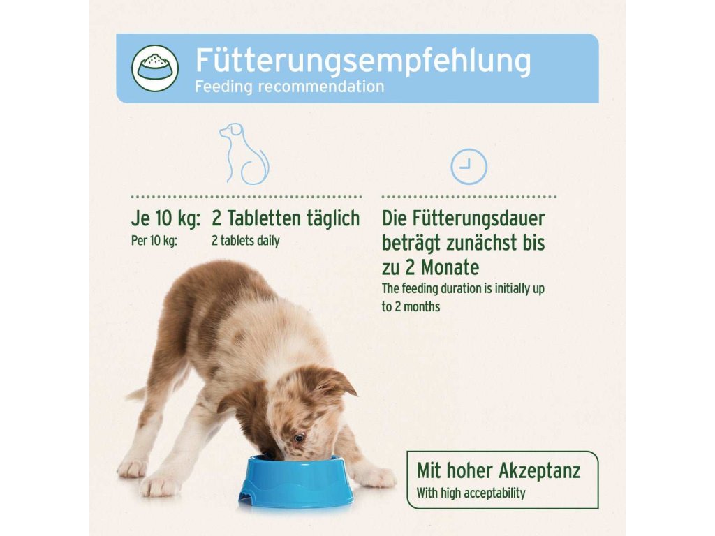 Doporučená doba přidávání doplňku do krmiva jsou 2 měsíce. Před použitím nebo prodloužením doby krmení se doporučuje poradit se s veterinárním lékařem. Dbejte prosím na vyvážené složení hlavní denní krmné dávky.