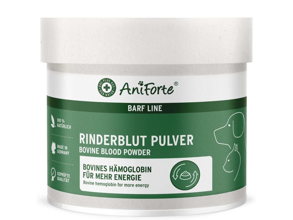AniForte® Prášek z hovězí krve se doporučuje pro každodenní dietu psů a koček s čerstvým masem (BARF), konzervami z čistého masa nebo vařeným jídlem. Je tak cenným doplňkem krmiva pro podporu druhově vhodného (syrového) krmení. Moučka z hovězí krve se skládá z čisté plné hovězí krve a je důležitým dárcem hemoglobinu. Pro získání vysokého množství hemoglobinu v krvi se suší velmi šetrným procesem rozprašováním.