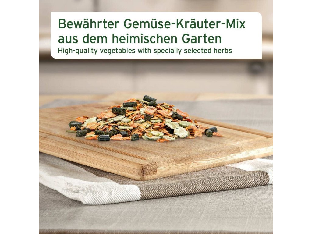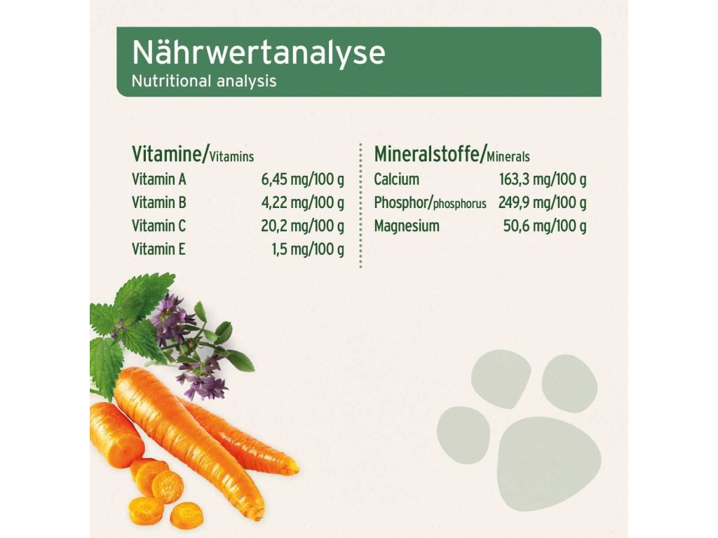 40% mrkvové vločky; 36% hrachové vločky; vojtěškové peletky, bylinková směs (zázvor, celý kmín, pískavice celá, fenykl, řezy z šípků, ostropestřec, listy rozmarýnu, tymián, jemně nasekaný heřmánek), 2% řezaných kopřiv, petržel
