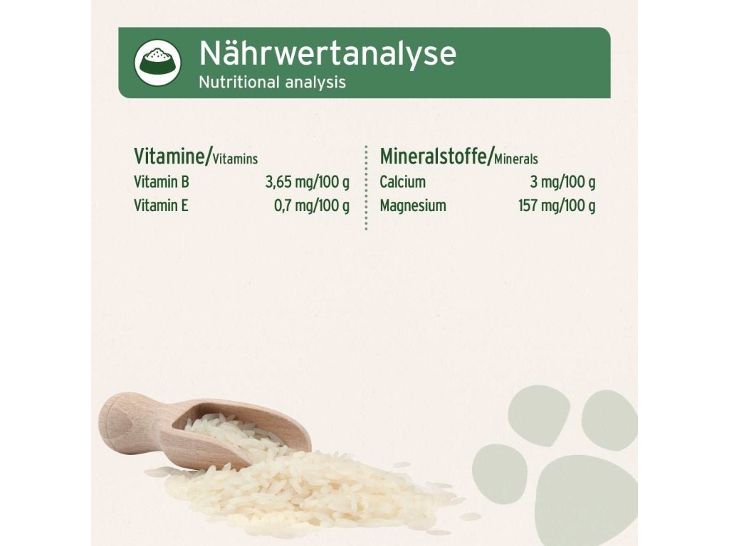 Pečlivé sušení a vzduchotěsné balení chrání cenné přírodní složky rýžových vloček, které jsou již oloupané a předvařené. Obsah tak zůstane déle čerstvý a vašemu miláčkovi dodá cenné živiny. Vločky mohou mít i podpůrný účinek při dietách.