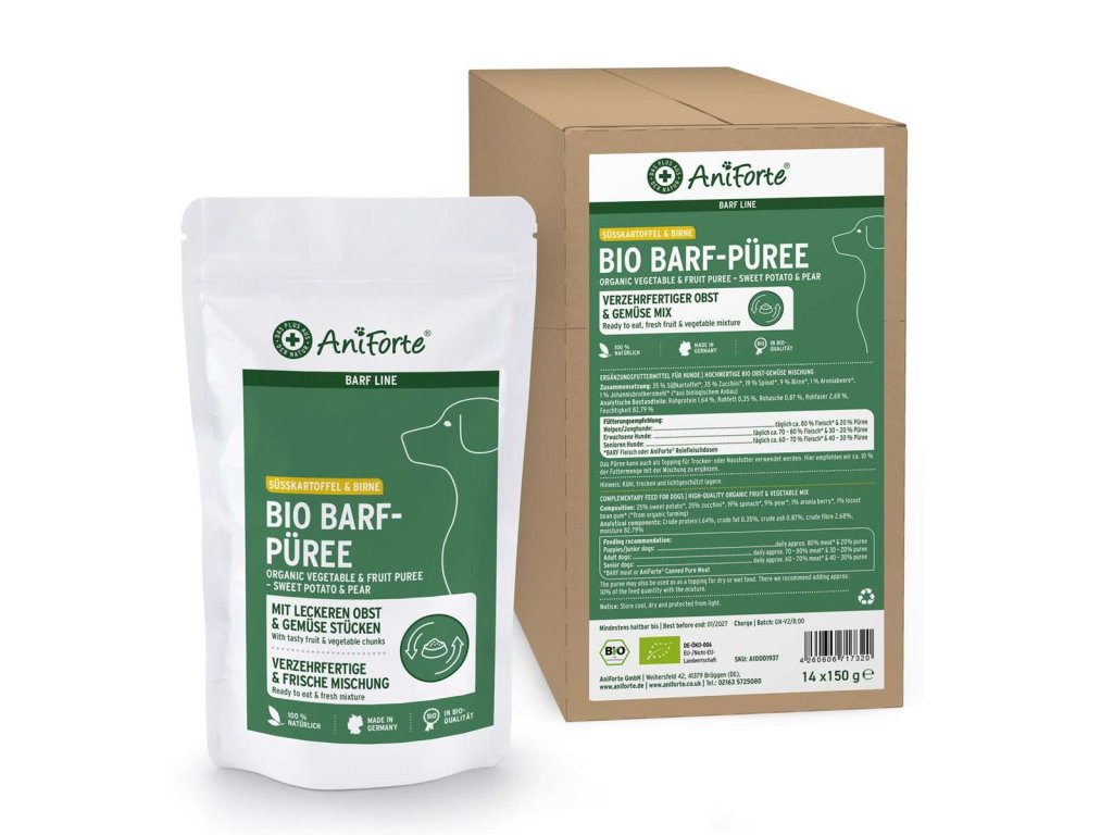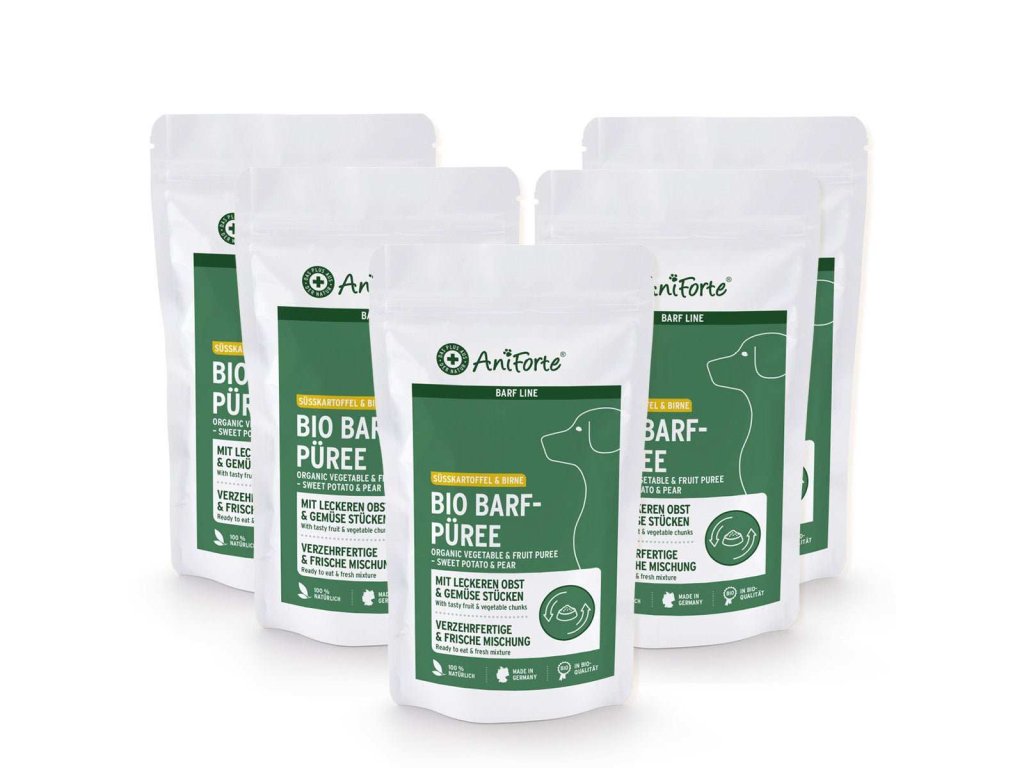 AniForte® BARF-Line organická zeleninová a ovocná směs s batáty a hruškami je ideální pro kombinaci s čistými masovými konzervami nebo jako doplňková zálivka pro suché a mokré jídlo.