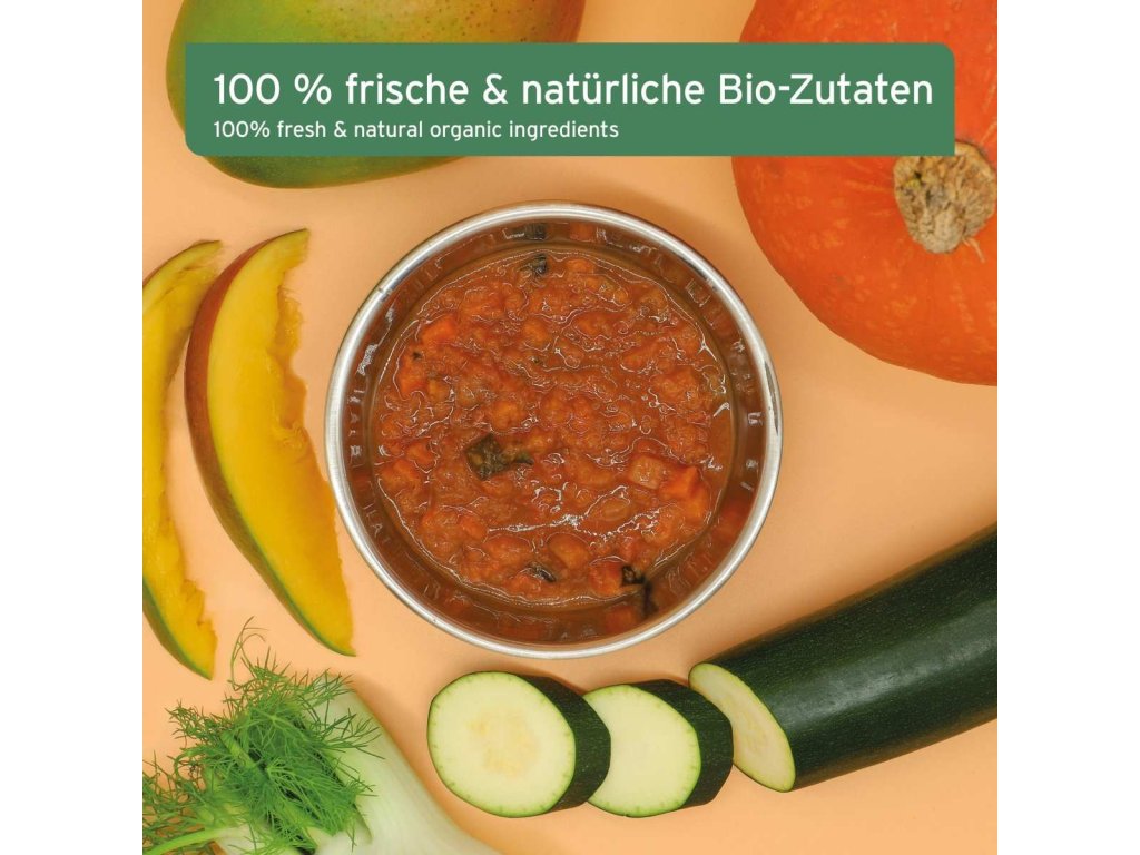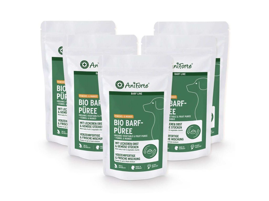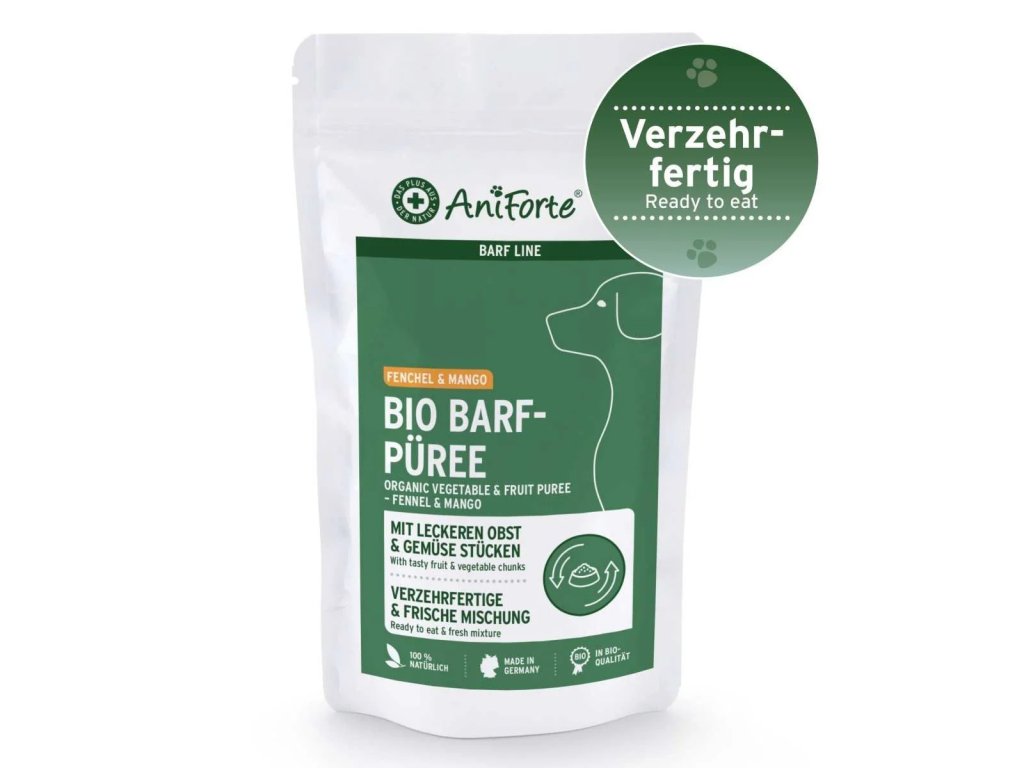 AniForte® BARF-Line organická zeleninová a ovocná směs s dýní, cuketou, konopím, fenyklem a mangem, je ideální pro kombinaci s čistými masovými konzervami nebo jako doplňková zálivka pro suché a mokré jídlo.