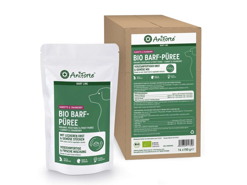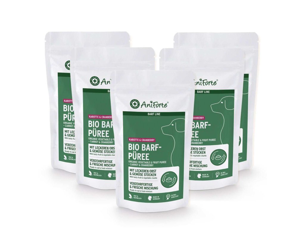 Naše AniForte® BARF-Line organická směs zeleniny a ovoce s mrkví, cuketou, pastinákem, jablkem a brusinkami, poskytuje vašemu čtyřnohému příteli čistě přírodní vitamíny a minerály na podporu zdravé stravy.
