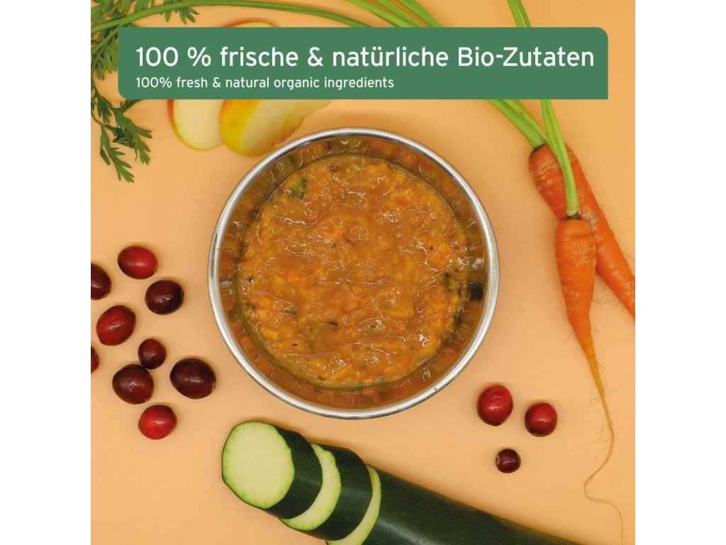 AniForte® BARF-Line organická zeleninová a ovocná směs s mrkví, cuketou, pastinákem, jablkem a brusinkami, je ideální pro kombinaci s čistými masovými konzervami nebo jako doplňková zálivka pro suché a mokré jídlo.