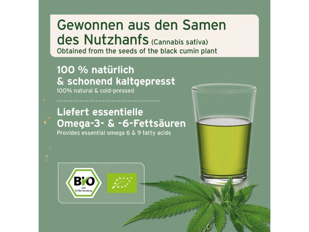 AniForte® Organic Hemp Oil je mastný rostlinný olej vyrobený ze semen konopí (Cannabis sativa). Neobsahuje tedy žádné omamné látky působící na nervový systém. Konopný olej je vysoce biologicky dostupný a má vysoký obsah esenciálních mastných kyselin, jako je kyselina linolová (omega-6) a kyselina α-(alfa-)linolenová (omega-3). Kyselina linolová se podílí na řadě biologických funkcí a hraje důležitou roli v buněčném růstu, imunitním systému a reprodukci. Esenciální mastné kyseliny navíc podporují normální vývoj kůže. Použití produktů z konopí se u zvířat osvědčilo zejména při udržování imunitního systému a funkce pohybového aparátu.