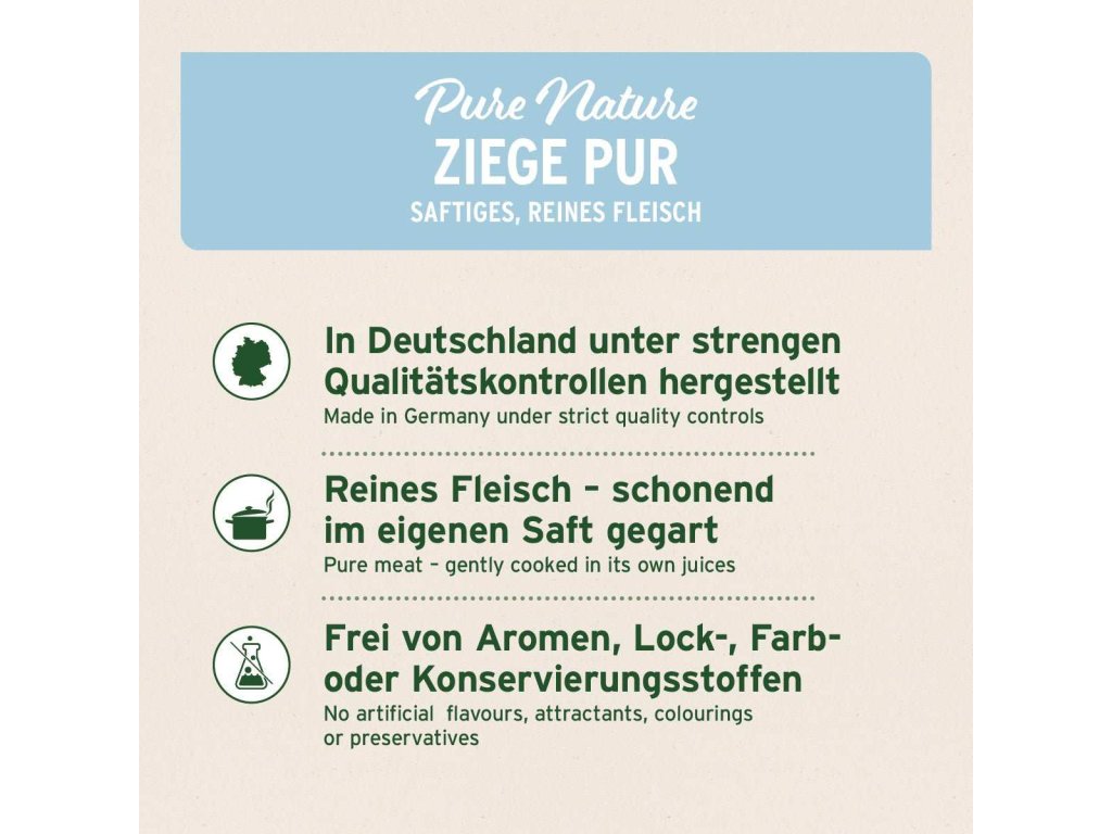 Mokré krmivo AniForte® PureNature je vysoce kvalitní jednoproteinové krmivo pro psy v superprémiové kvalitě - vyrobené v Německu podle potravinářských norem. Tajemstvím naší kvality je ve velkém množství čerstvého a kvalitního masa, které pro AniForte® PureNature používáme. Dbáme na vysokou kvalitu našich surovin a podrobujeme je pravidelným veterinárním kontrolám! Samotná kontrola však není jedinou zárukou našich vysokých standardů kvality. Maso získáváme téměř výhradně od výrobců, s nimiž již léta spolupracujeme v důvěryhodném vztahu. Suroviny jsou zpracovány co nejrychleji, aby byla zachována jejich čerstvost a přirozené vitamíny. Tímto způsobem dokážeme téměř zcela zachovat všechny cenné ingredience. Jen tak zajistíme dobrou výživu, která navíc obzvláště dobře chutná.