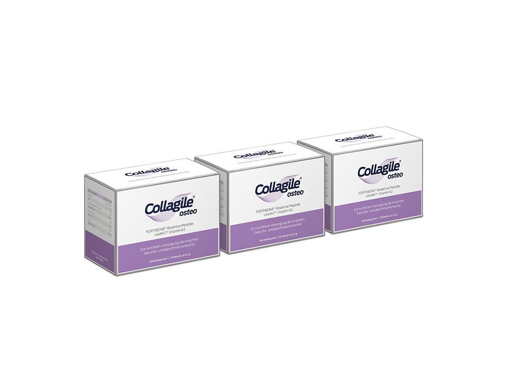 Collagile® osteo se skládá ze specificky nutričně funkčních peptidových frakcí, vysoce čištěného extraktu hydrolyzovaného, enzymaticky štěpeného hydrolyzátu živočišného původu z hovězích kostí. Další důležitou složkou je přírodní vitamín K2 s velmi vysokou biologickou dostupností.