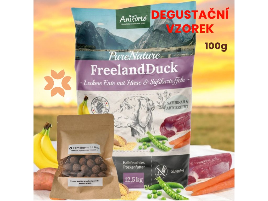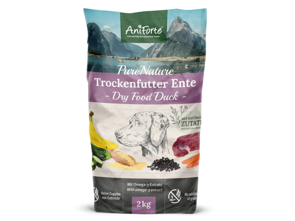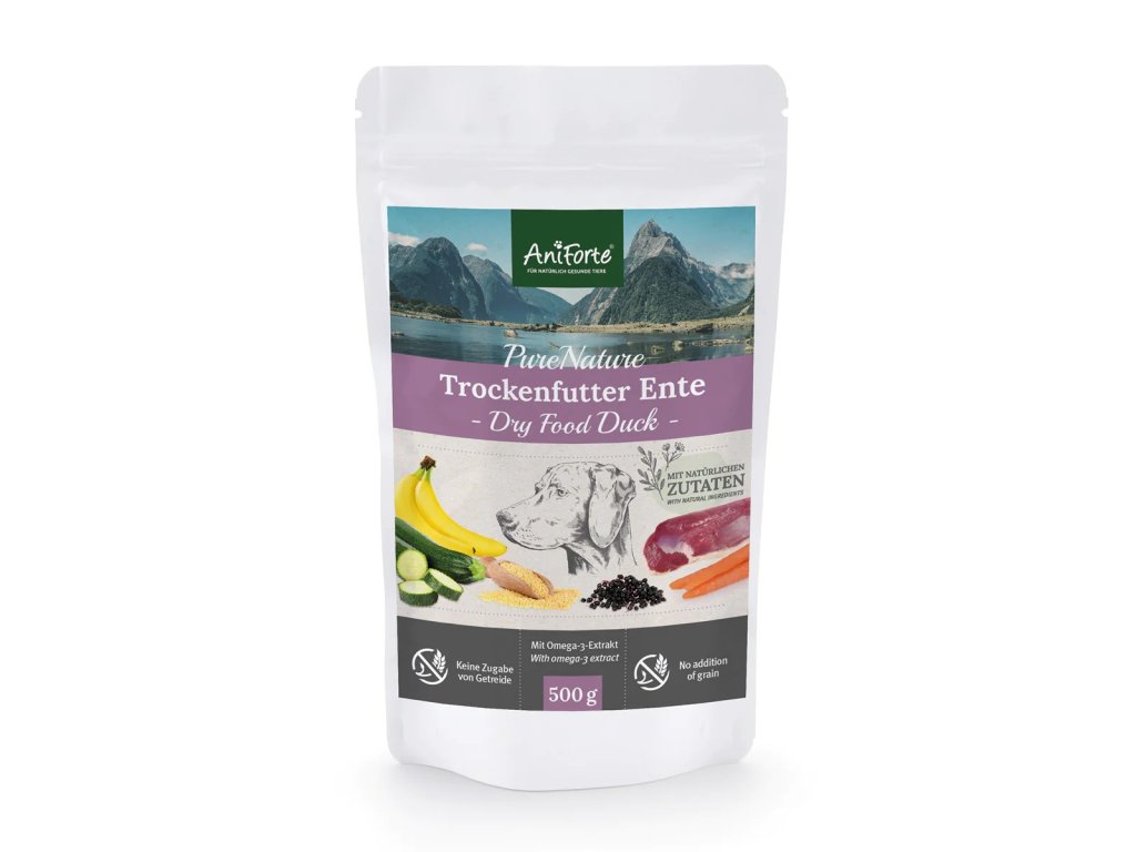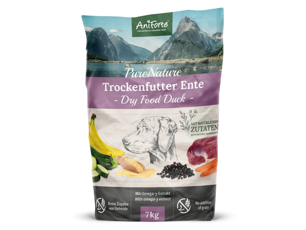 AniForte® FreelandDuck je vysoce kvalitní, prémiové krmivo pro psy skládající se z 65,0% čerstvého kachního masa, jáhel a pouze čerstvé zeleniny, jako je mrkev a cuketa. Spolu s křupavými hruškami, zralými banány a také středomořskými bylinkami majoránkou a šalvějí je to také čistá pochoutka pro psy citlivé na některé druhy krmení. Granule PureNature je lahodná pochoutka bez umělých přísad, pro malé i velké psy v nesrovnatelné kvalitě a s unikátní recepturou - všestranná výživa šetrná ke všem psům!