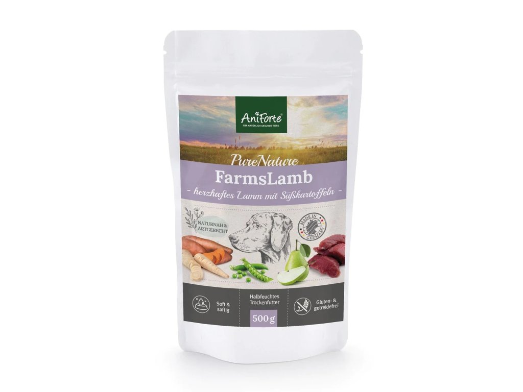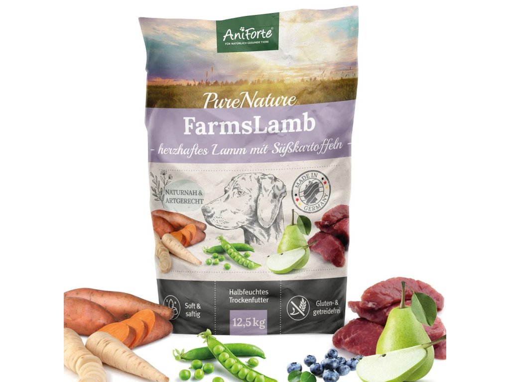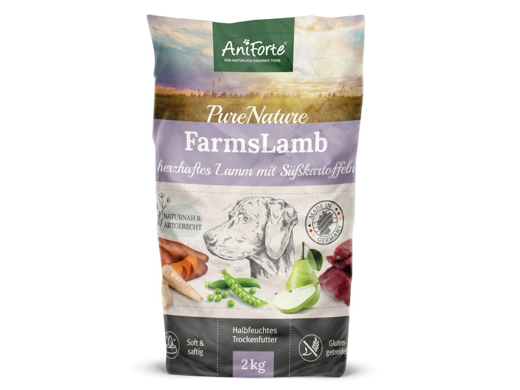 AniForte® PureNature FarmsLamb je polovlhké, vysoce kvalitní prémiové krmivo pro psy, které optimálně pokrývá denní nutriční potřeby vašeho dospělého psa. Skládá se z extra množství vydatného jehněčího masa jako jediného zdroje bílkovin, brambor jako přílohy, zušlechtěných vynikající ovocnou a zeleninovou směsí batátů, hrušek, pastináku, hrášku a mrkve.