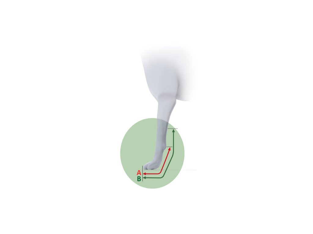 Míra "B" se vztahuje k celkové délce dlahy. Umístěte pružnou pásku pod tlapku zvířete a měřte od nejdelšího prstu na noze, který se rozšíří od měření "A" až do poloviny předloktí (ve stoje).