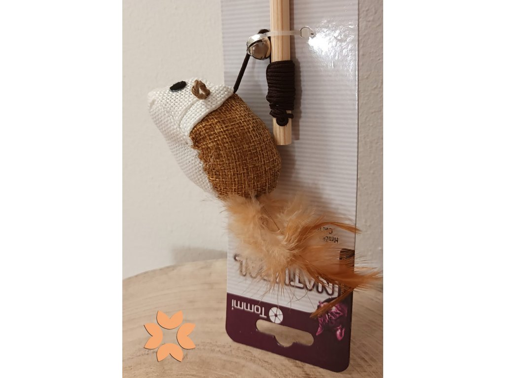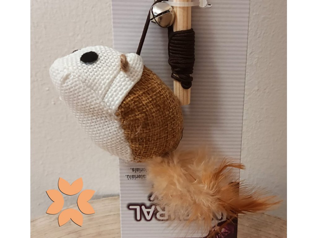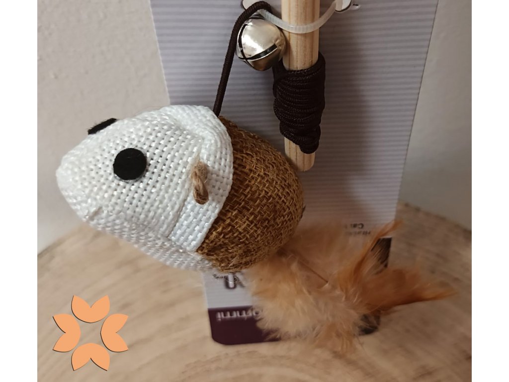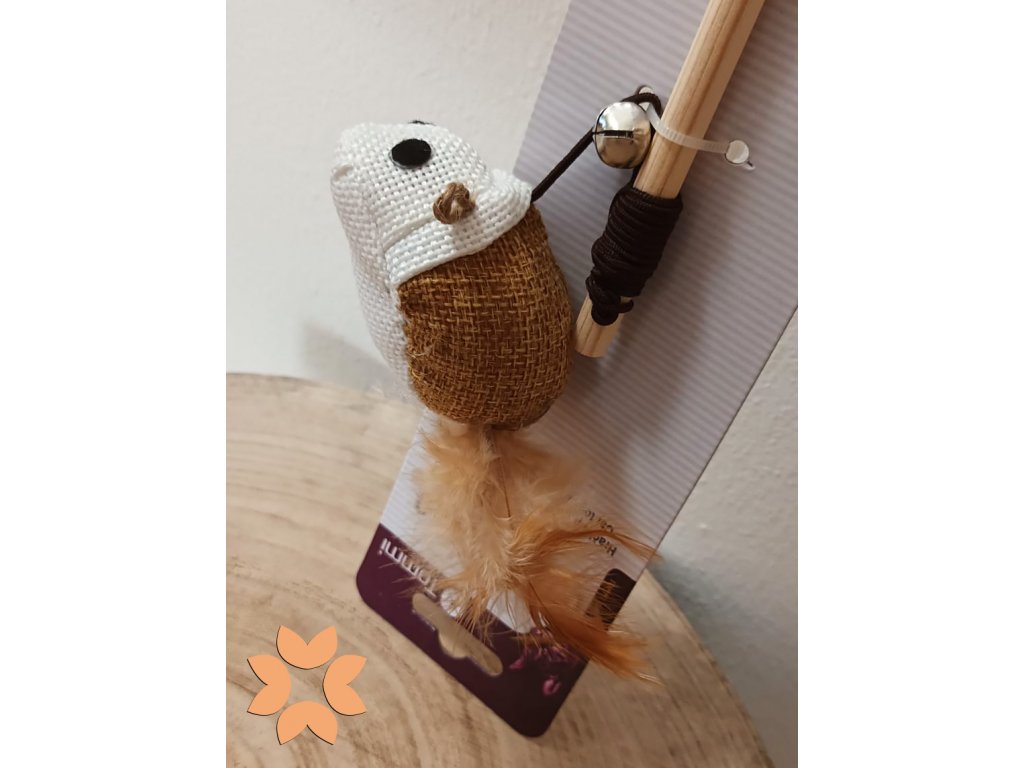 Dřevěná udice s bílo hnědou myškou a rolničkou pro kočky z přírodních materiálů. Bezpečná a bez ostrých hran.