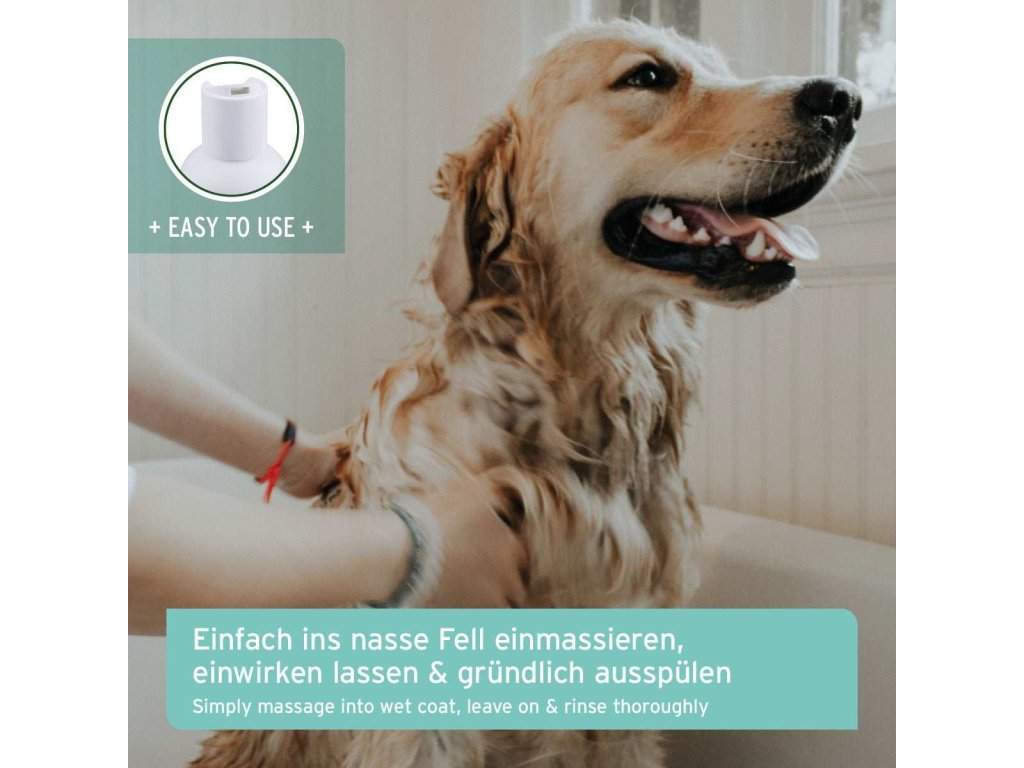 Srst důkladně namočte vlažnou vodou. Šampon vmasírujte do srsti, dokud se nevytvoří jemná pěna. Nechte působit 3 až 5 minut a poté důkladně opláchněte. Při silném znečištění lze koupání opakovat. V případě následného fénování nastavte teplotně fén na nízký stupeň.