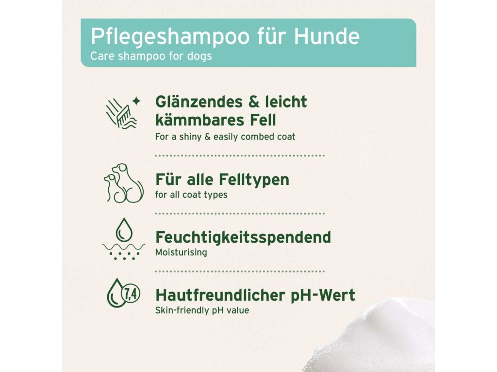Vzhledem k jemným a rostlinným mycím aktivním látkám je šampon ideální pro pravidelné používání a pro dlouhosrsté psy. Tím je zachována přirozená rovnováha pokožky a srsti, nádherně vonící po svěží vůní kokosu.