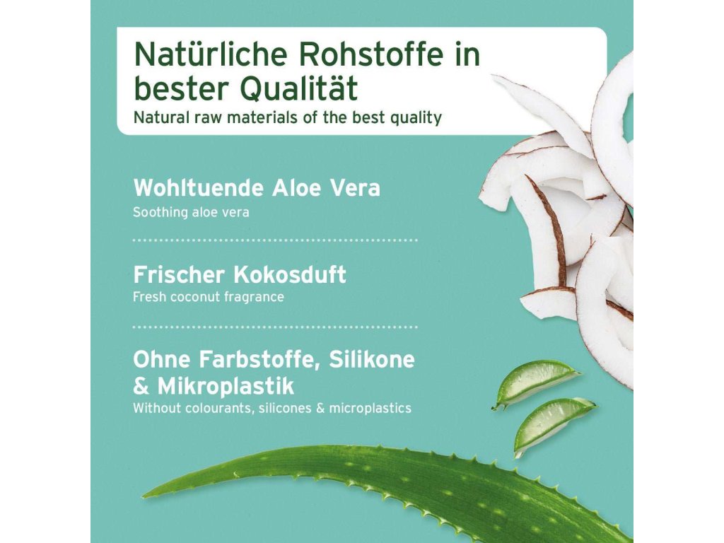 Aqua (voda), šťáva z listů Aloe Barbadensis, decylglukosid, glycerin, propylenglykol, xanthanová guma, fenoxyethanol, extrakt z kokosu nucifera (kokos), parfém (vůně), kyselina citronová, etylhexylglycerin, kumarin | Obsahuje: 5 - 15% neiontové povrchově aktivní látky