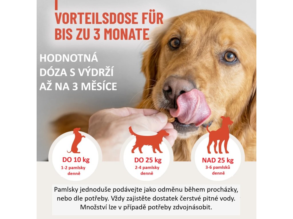Snadno stravitelná receptura bez cukru a obilovin je vhodná i pro citlivé psy. Pamlsky se pohodlně porcují a skvěle se hodí jako odměna během dne.