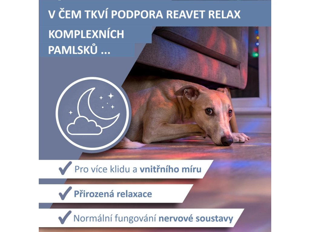 Někteří psi reagují citlivě na nové nebo stresové situace – cestování, návštěvy veterináře, bouřky, změny prostředí či náročné fáze výcviku. Relax Complex pamlsky od REAVET představují vyvážený doplněk stravy, který pomáhá psům zvládat tyto momenty s větším klidem a jistotou. Pečlivě vytvořená receptura spojuje funkční živiny s tradičně používanými rostlinnými extrakty a stává se tak cennou součástí každodenní péče.