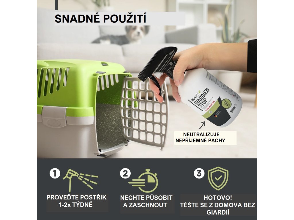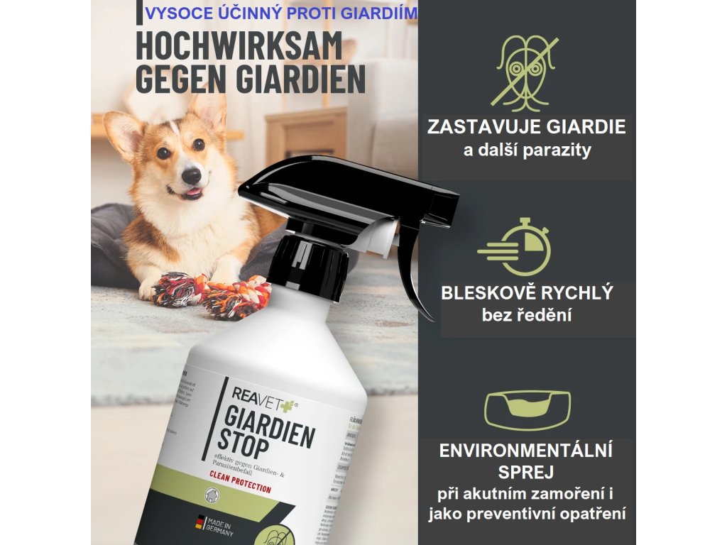 REAVET Giardia Spray je hygienický dezinfekční prostředek pro domácí mazlíčky. Používá se rozprašováním na povrchy/plochu. Díky tomu je snadné a jednoduché udržovat cvičební plochy, hračky a předměty bez otravných giardií a dalších mikroorganismů. Kromě toho také odstraňuje nepříjemné pachy, které mohou vzniknout při napadení parazity Giardia.