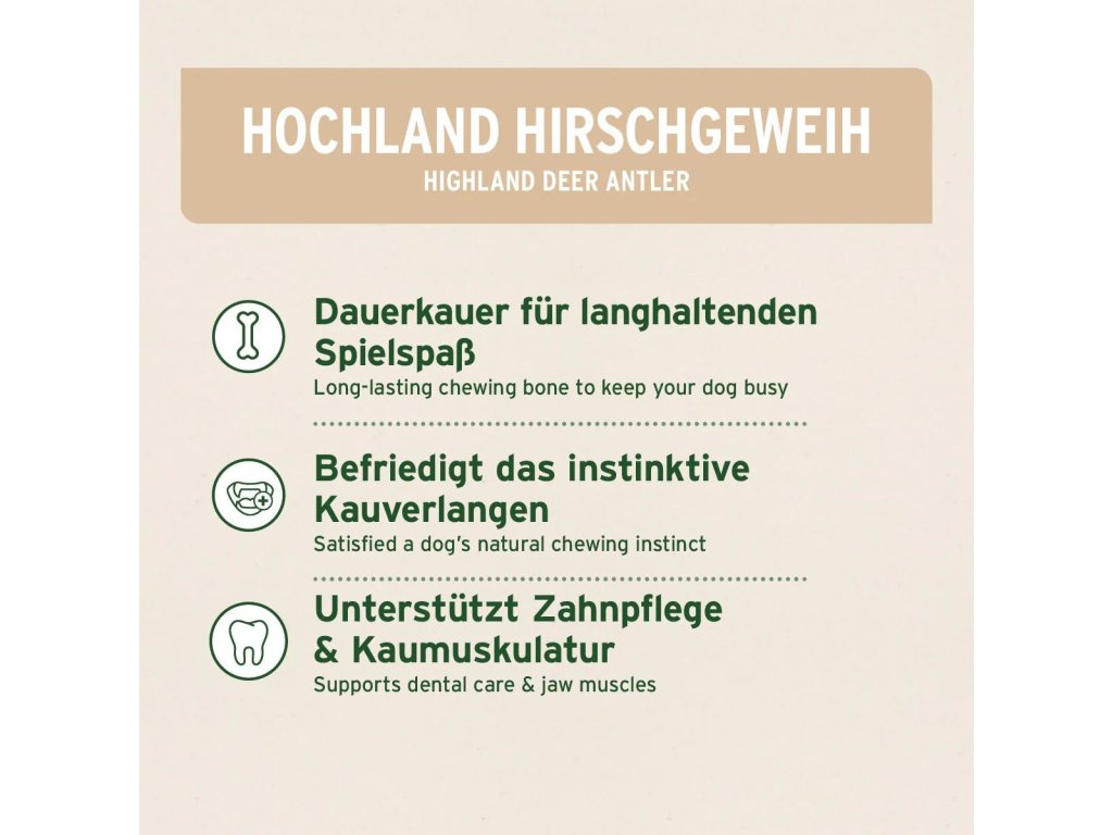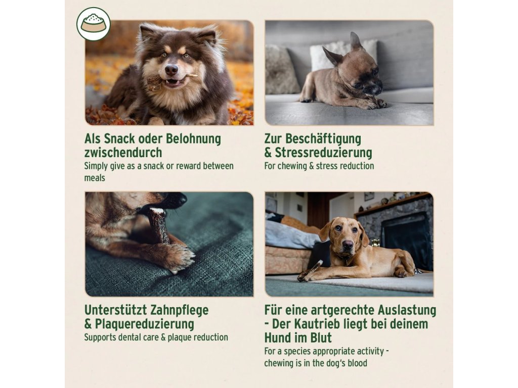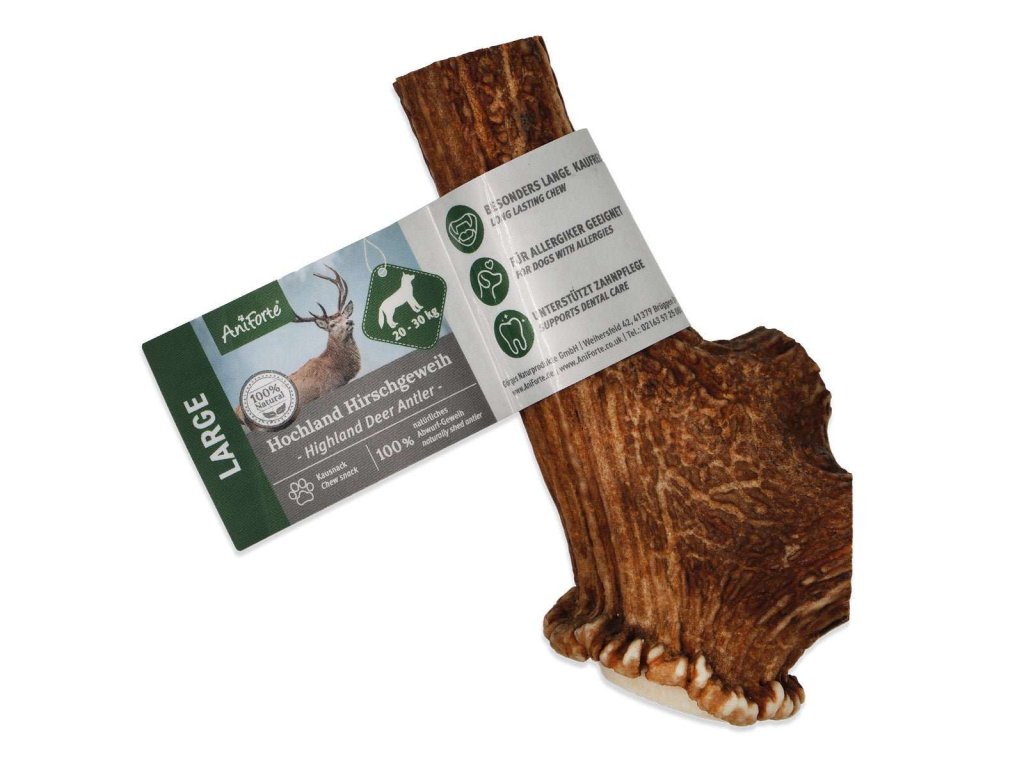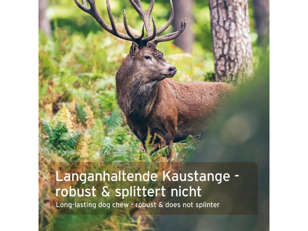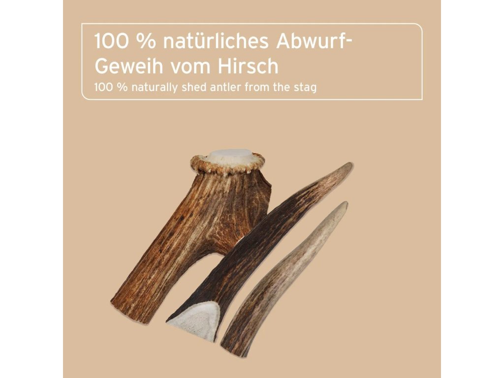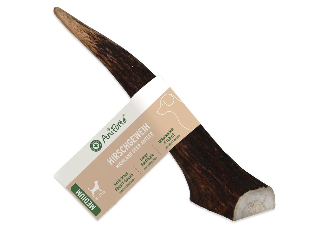 AniForte® jelení paroh je nová přirozená zábava pro žvýkání pro vašeho psa. Díky svému pevnému a robustnímu tvaru je parohový kus vhodný jako trvalá žvýkací kost. Žvýkací tyčinky se nedrolí, jsou nízkotučné a díky svému 100% přírodnímu složení jsou vhodné zejména pro alergiky nebo psy s intolerancí. Jelení paroh nabízí vašemu psovi nejen spoustu zábavy, ale může mít i pozitivní a čistící účinek na zuby. Kousky parohu jsou nejen super chutné, trvanlivé a bez umělých přísad, obsahují také cenné přírodní minerály.