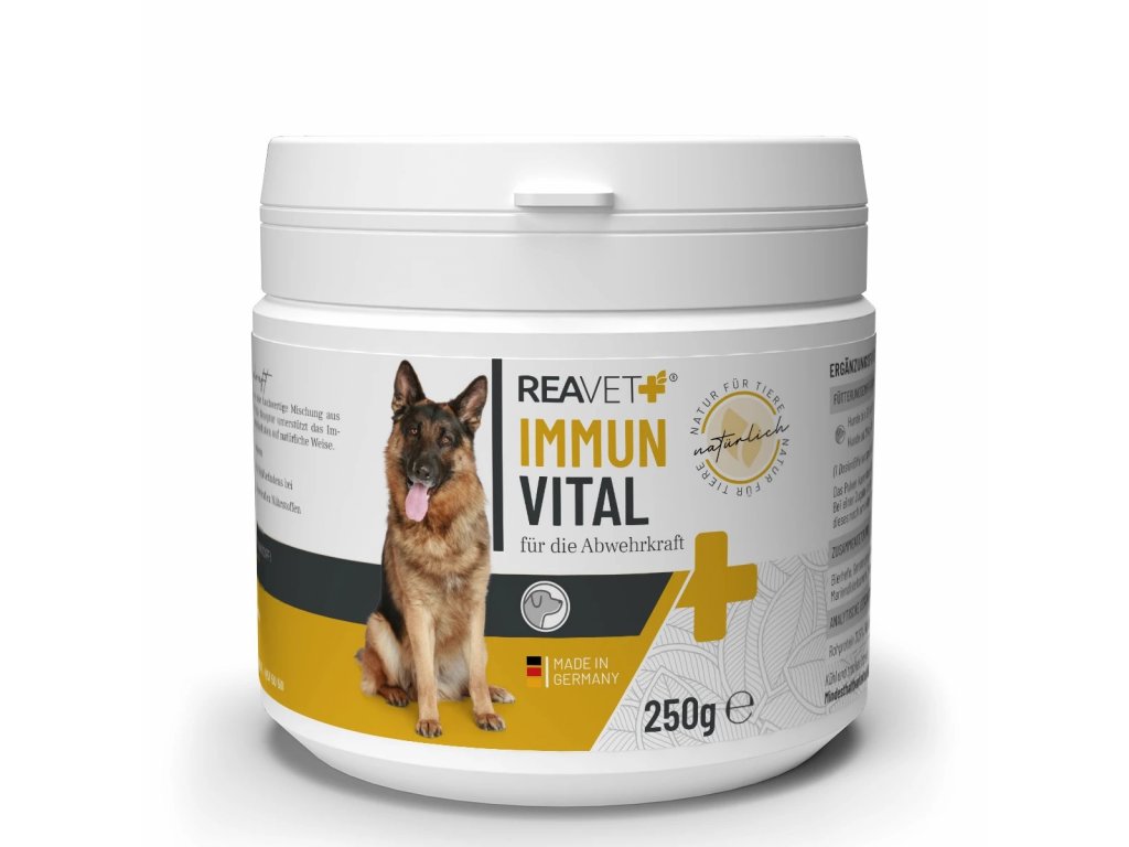 REAVET Immun Vital je vysoce kvalitní směs četných výživných bylin. Zdravé složení pivovarských kvasnic, ječmene a šípků přirozeně podporuje imunitní systém a celkovou pohodu vašeho psa. Zvířata jej v pohodě přijímají - doplněk lze snadno přimíchat do jejich každodenního krmení.