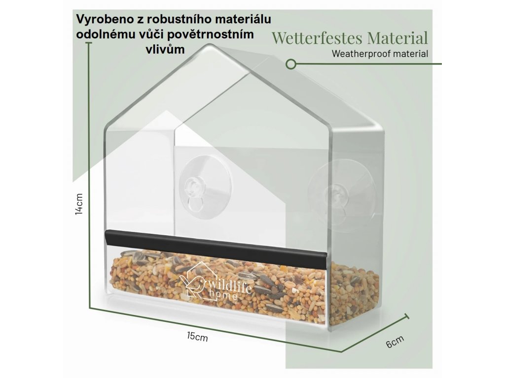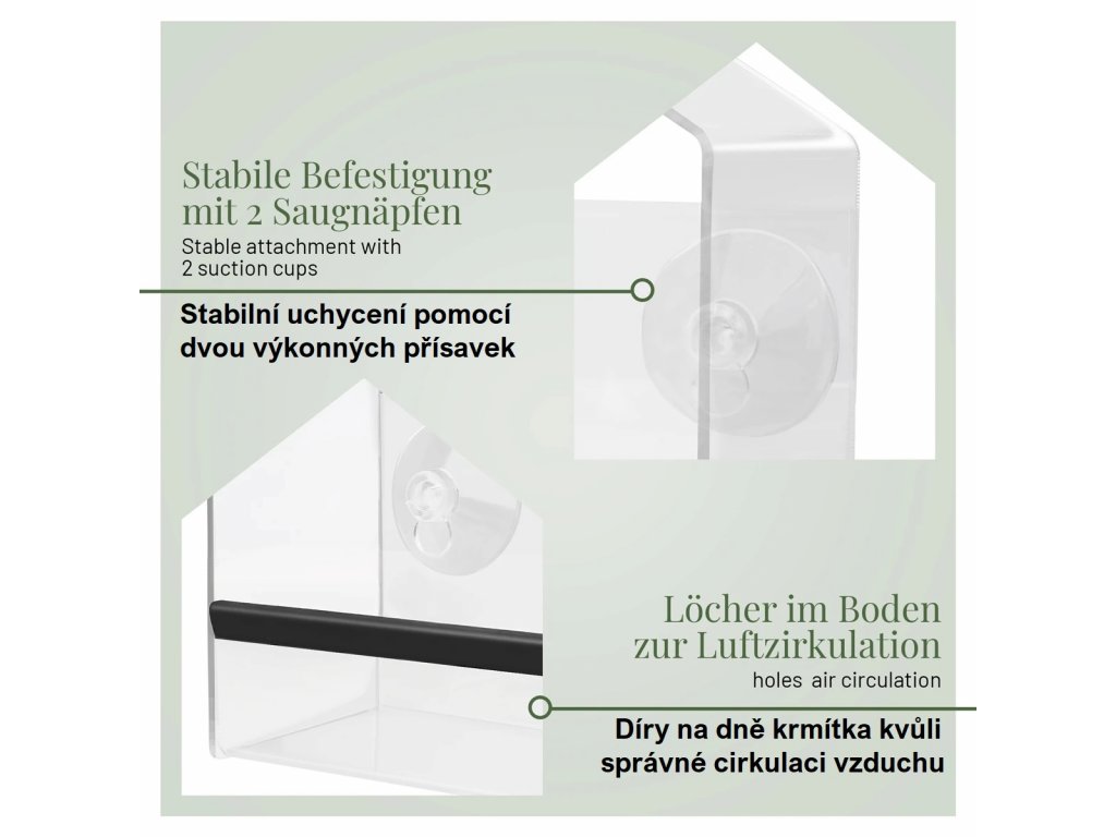 Díky ochranné stříšce zůstanou ptačí pochutiny a opeření hosté v suchu i při dešti. S robustními přísavkami nabízí toto krmítko pro ptáky snadné připevnění k hladkým povrchům pro jedinečný zážitek z obdivování ptačího života z nejbližší vzdálenosti, jak jen je to možné. Otvory v základně zajišťují efektivní cirkulaci vzduchu. To podporuje nejen hygienické prostředí pro opeřené návštěvníky, ale pomáhá též krmivu zůstat déle čerstvé a použitelné.