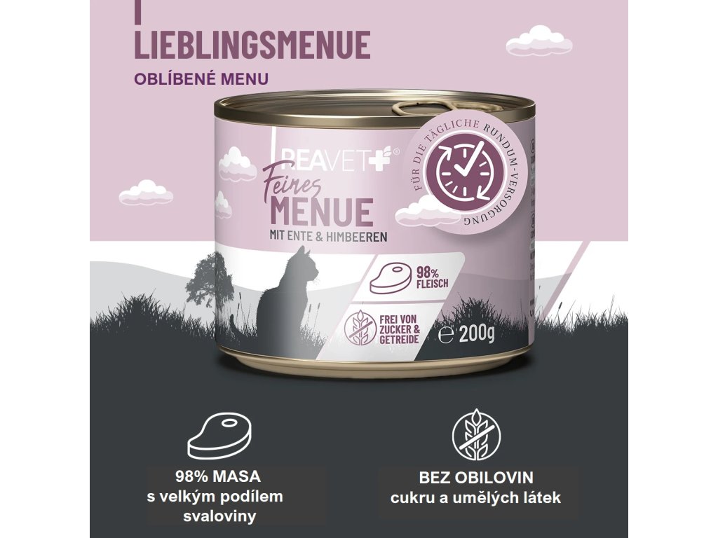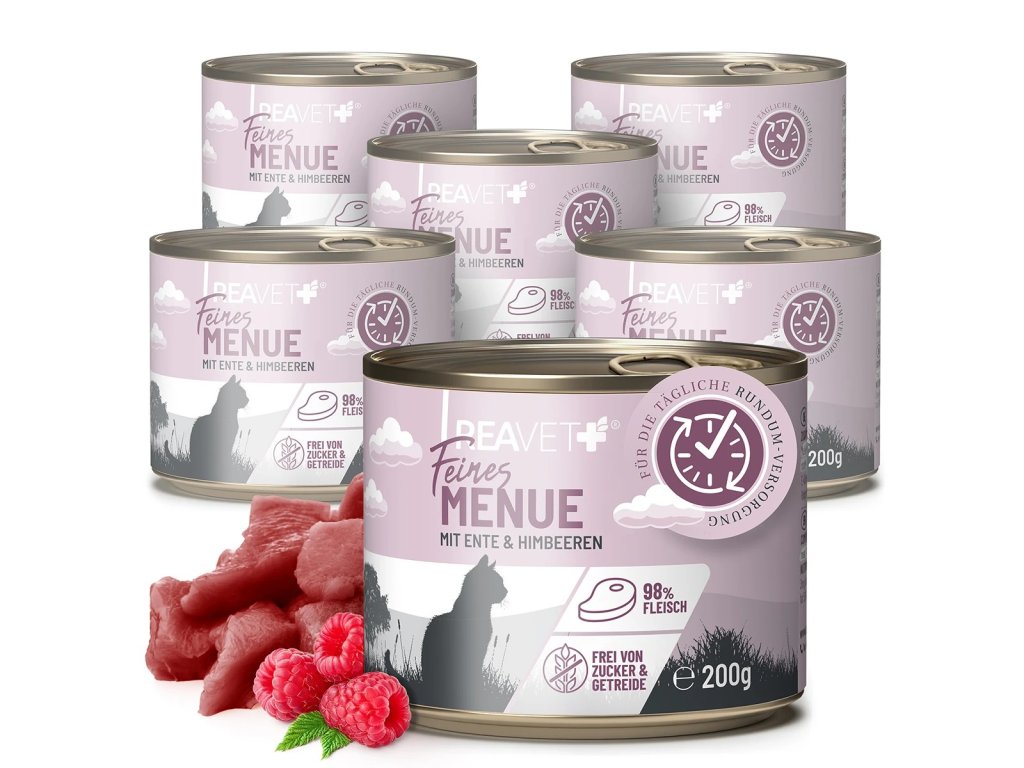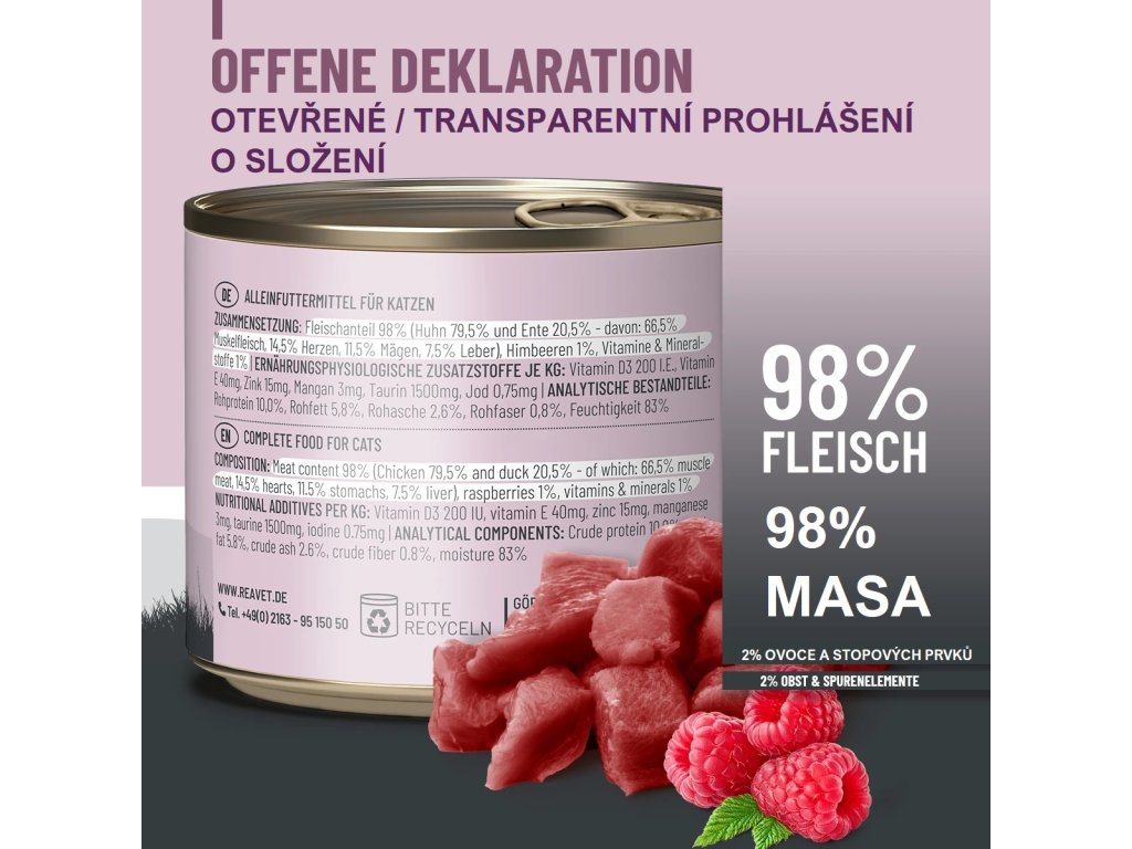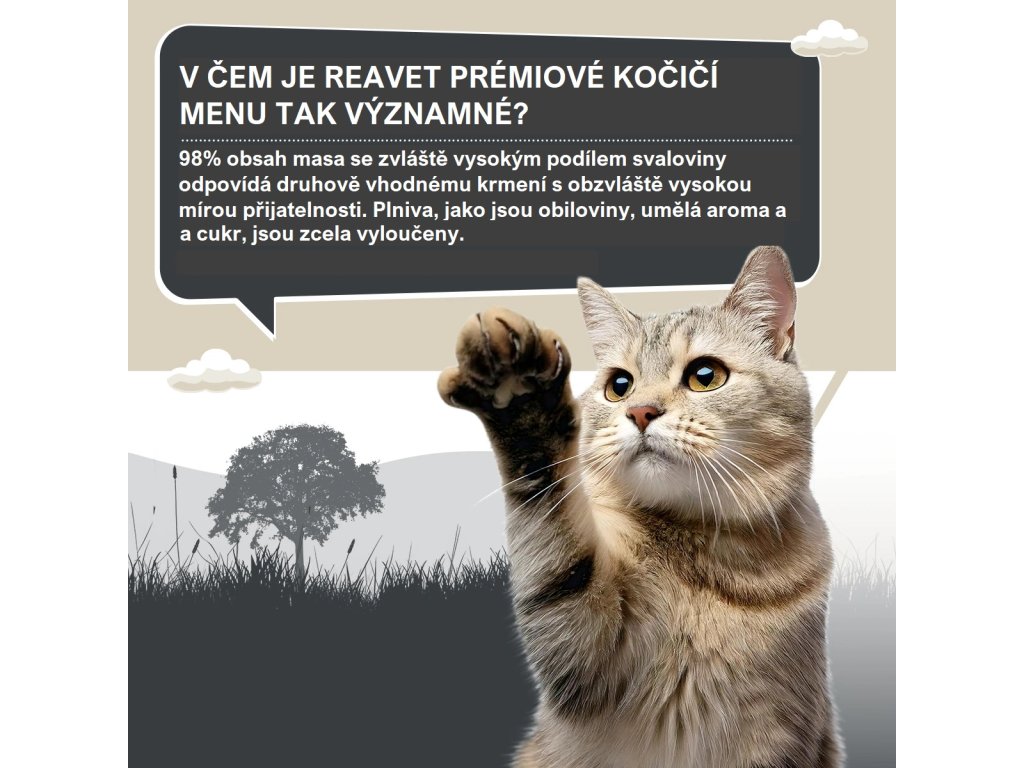 Menu mokrých jídel REAVET Fine se skládá z 98 % z vysoce kvalitního masa s vysokým podílem svaloviny. Tato kvalita masa zajišťuje nejen přirozenou chuť, ale poskytuje též hodnotné, vysoce kvalitní bílkoviny – ideální pro druhově vhodnou stravu pro vaši kočku či kocourka.