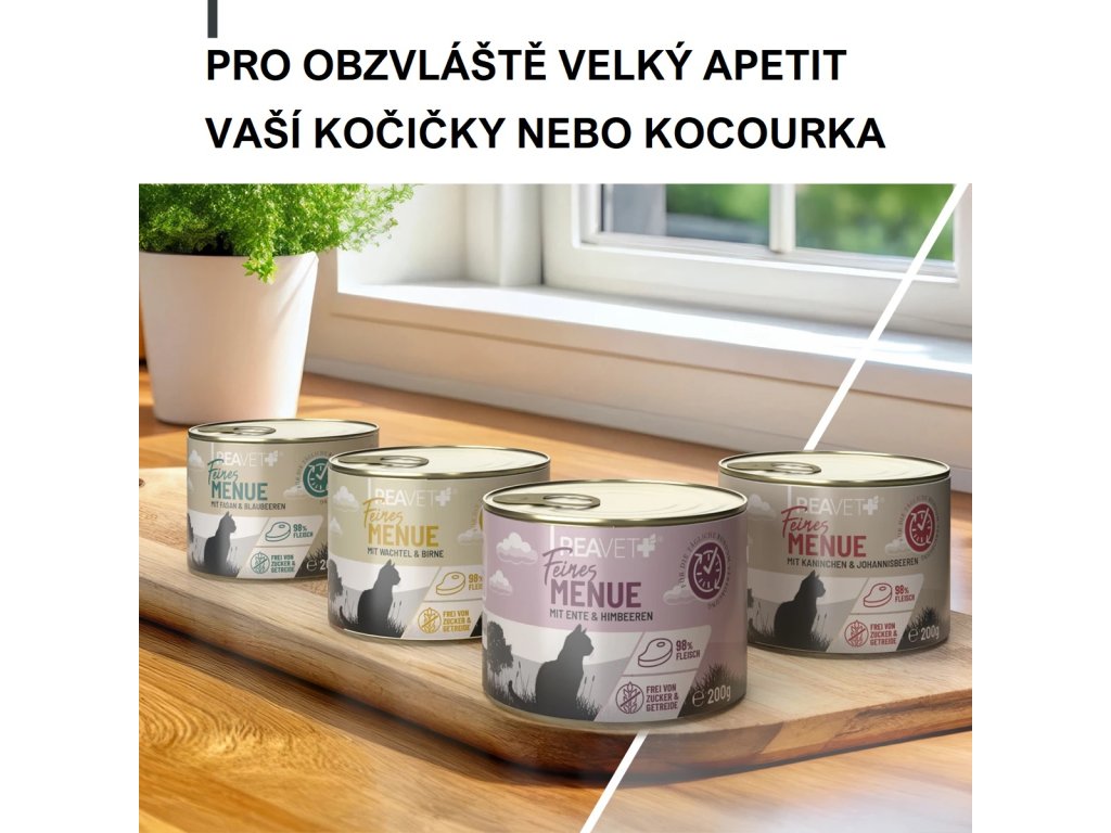 Naše REAVET Fine prémiové menu nabízí vašemu malému gurmánovi přesně to, co potřebuje – 100% požitek a vyváženou stravu. Se 4 lahodnými variantami, které byly vyvinuty speciálně pro náročné kočky, zaručujeme vám a vašemu mazlíčkovi každodenní chuťový zážitek.
