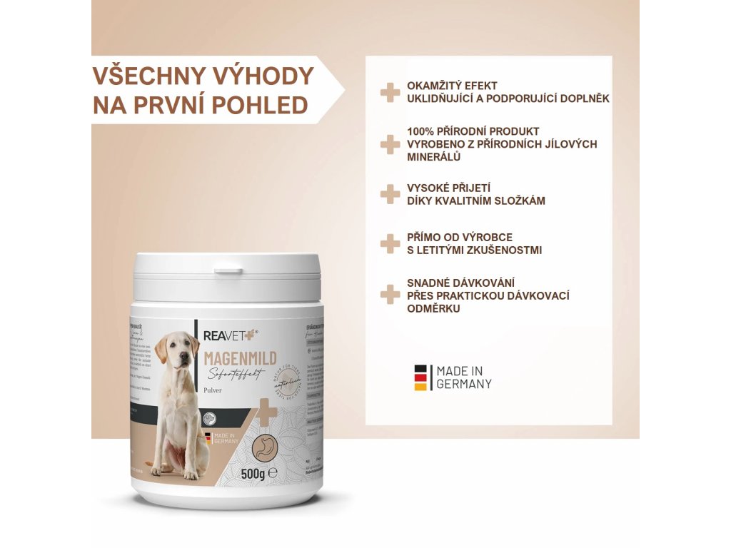 Náš REAVET prášek na jemný žaludek pro psy je vyváženou směsí přírodních jílových minerálů. Prášek z granulátu podporuje střevní flóru, trávení a normální činnost trávicího traktu vašeho psa a může také přispívat k normální kvalitě stolice. Bentonit je minerální jíl složený z různých jílových minerálů. Díky montmorillonitu obsaženému v bentonitu má horninový prášek silnou schopnost absorbovat vodu. Volně se vyskytující tekutiny v trávicím traktu mohou být bentonitem vázány a spolehlivě odváděny z těla ven. Tím se také pozitivně podpoří normální gastrointestinální činnost.