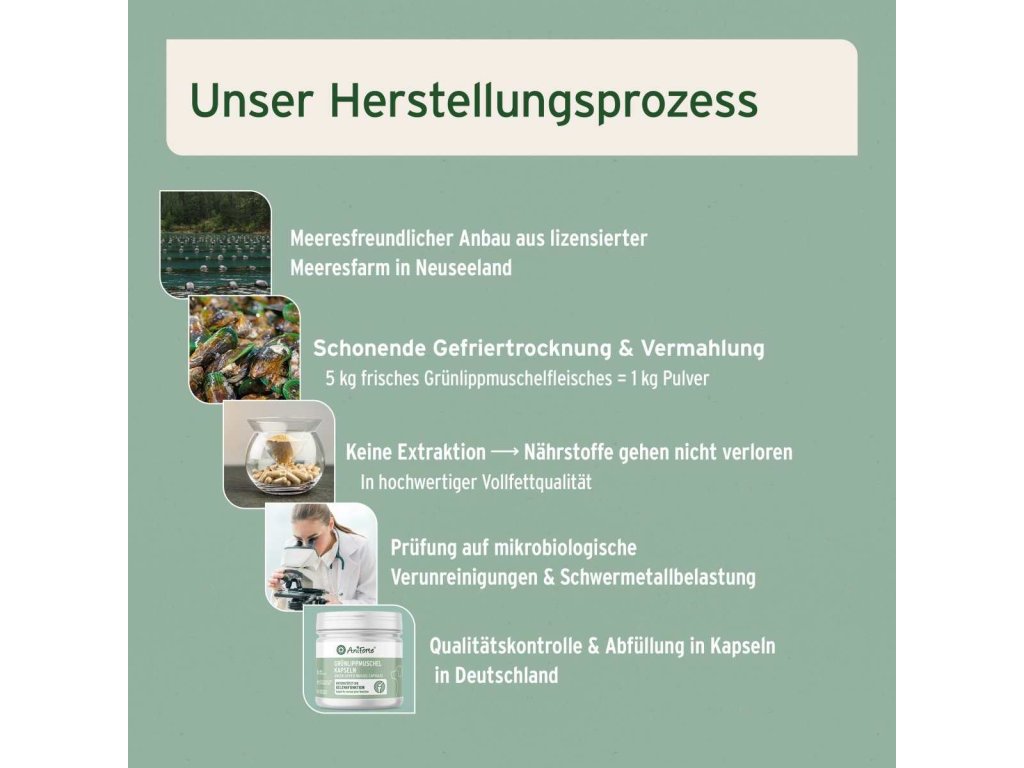 Náš prášek ze slávky zelenoústé obsažený v kapslích pochází z licencované mořské farmy na Novém Zélandu. Tam se mušle zpracují jako celek šetrnou lyofilizací - to znamená, že živiny jsou téměř zcela zachovány. Získaný prášek se navíc neextrahuje, takže náš produkt má obsah tuku 10,2%. Vysoký obsah tuku je kladným kvalitativním znakem tablet slávky zelenoústé. Kapsle neobsahují umělé přísady, plniva ani obiloviny.