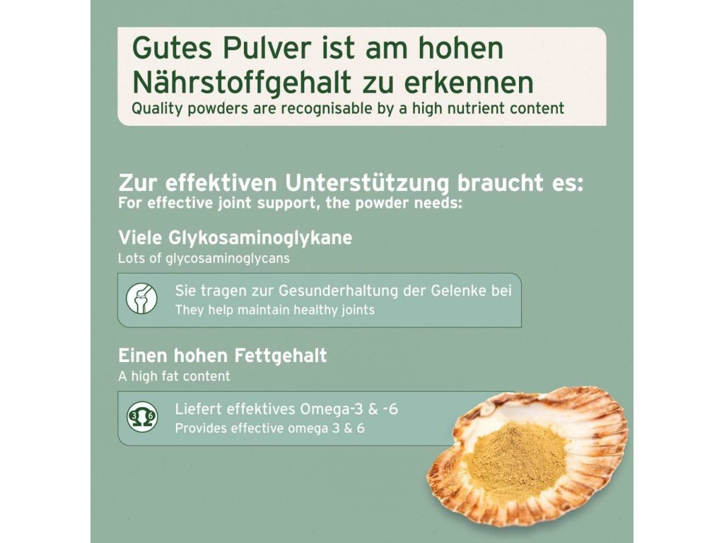 Většina prášků z mušle zelené je označena jako extrakt, což zní poměrně dobře, ale v tomto případě to není vůbec užitečné. V případě extraktů je sušený prášek odmaštěn. Zejména u zelených mušlí je vysoký obsah tuku kladným kvalitativním znakem, protože zajišťuje přísun esenciálních omega-3 a -6 mastných kyselin.