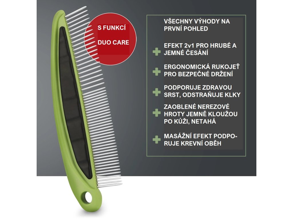 Zaoblené nerezové hroty zajišťují nejen bezpečnost při česání, ale umožňují i příjemnou masáž, která udržuje pokožku vašeho mazlíčka zdravou. Tím též podporuje krevní oběh vašeho mazlíčka. Hustá strana je ideální pro přesné česání na citlivých partiích, jako jsou uši a nohy, a také pro snadné odstraňování zacuchanců. Velkorysá hustá strana je ideální pro jemné uvolňování uzlíků, hýčkání nadýchaných vlasů a hladké rozčesávání srsti.