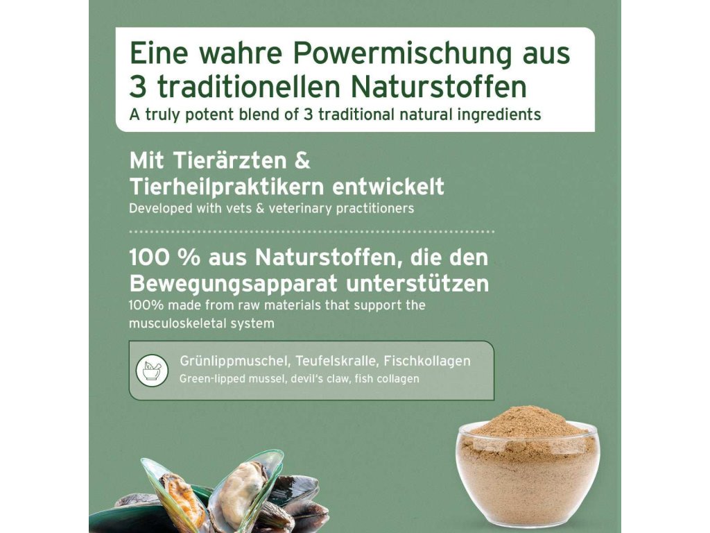 AniForte® GelenkVETAL 3 obsahuje trio čistých přírodních látek, o jejichž pozitivních vlastnostech je po staletí známo, že podporují pohybový aparát vašeho psa. A jaké že to jsou? Mletý kořen Ďáblova drápu, kolagenový prášek z mořských ryb a prášek ze slávky zelenoústé.