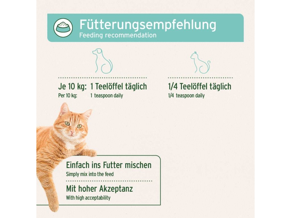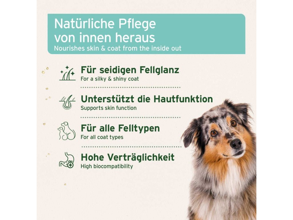 Co mám použít v rámci vnitřního užití ...: | Pro zdravou a vitální kůži, Pro zdravou a vitální srst, Pro lesklou a hedvábnou srst, Na svědivou a podrážděnou kůži, Na regulaci tvorby kožního mazu |
