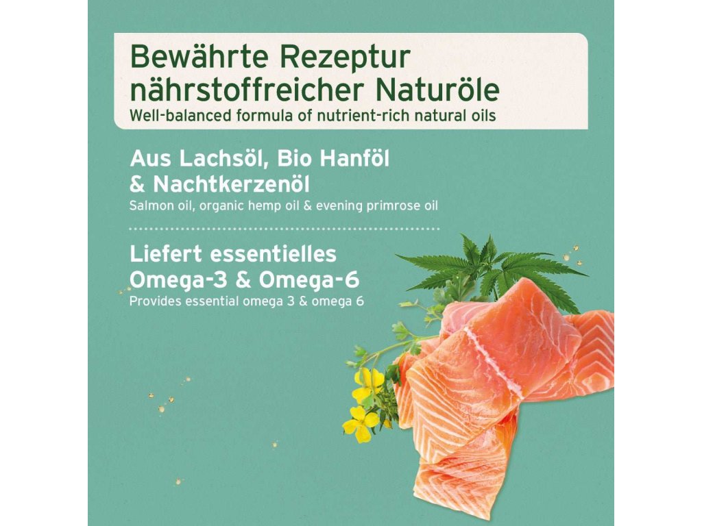 - Kombinace vysoce kvalitních přírodních olejů (lososového oleje, konopného oleje a pupalkového oleje).