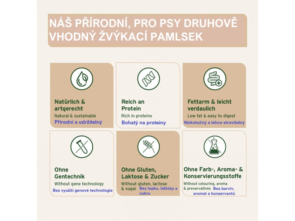 - Přírodní žvýkací pamlsek ze 100% králičího masa, obzvláště dobře snášený všemi pejsky.