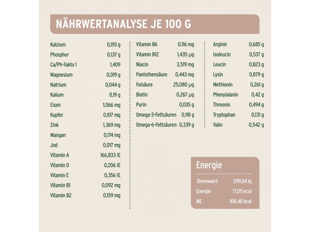 9,9% bílkovin; 6,2% obsahu tuku; 2,3% hrubého popela; 0,6% hrubé vlákniny; 75,0% vlhkosti; 0,22% vápníku; 0,15% fosforu