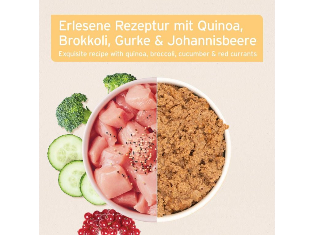 Chutné složení jemného krůtího masa se spoustou zdravé zeleniny a bezlepkovou quinoou se hodí i pro nepříliš aktivní psy nebo jako lehké letní jídlo do horkých dnů. Ovocný rybíz, křupavý hlávkový salát a středomořské bylinky přinesou vašemu psovi chuť léta v letní psí kuchyni.
