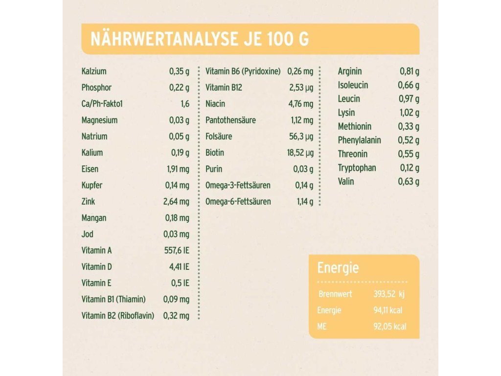 0,5% prášek z vaječných skořápek; 0,1% rakytníku; bylinky (rozmarýn, tymián, majoránka); 0,1% konopný olej; 0,1% strouhaný kokos; 0,1% křemelina