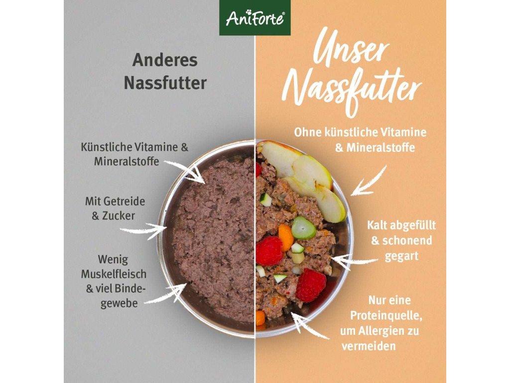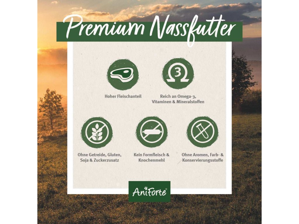 Mokré krmivo AniForte® PureNature je vysoce kvalitní jednoproteinové krmivo pro psy v superprémiové kvalitě - vyrobené v Německu podle potravinářských norem. Tajemstvím naší kvality je ve velkém množství čerstvého a kvalitního masa, které pro AniForte® PureNature používáme. Dbáme na vysokou kvalitu našich surovin a podrobujeme je pravidelným veterinárním kontrolám! Samotná kontrola však není jedinou zárukou našich vysokých standardů kvality. Maso získáváme téměř výhradně od výrobců, s nimiž již léta spolupracujeme v důvěryhodném vztahu. Suroviny jsou zpracovány co nejrychleji, aby byla zachována jejich čerstvost a přirozené vitamíny. Tímto způsobem dokážeme téměř zcela zachovat všechny cenné ingredience. Jen tak zajistíme dobrou výživu, která navíc obzvláště dobře chutná.