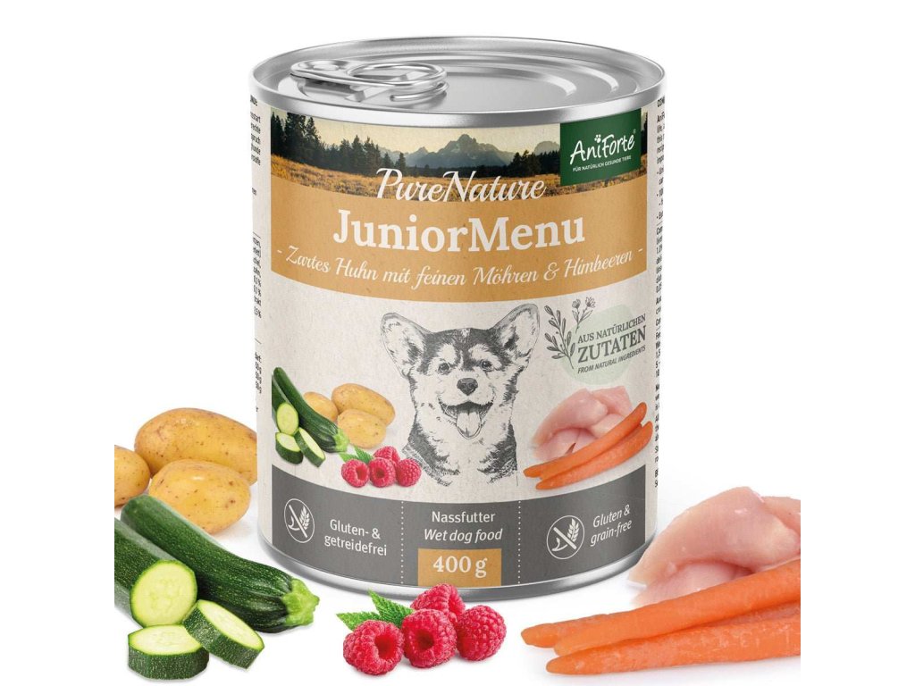 Mokré krmivo "PureNature JuniorMenu - křehké kuře s mrkví, a 2x BEZ => bez obilovin a bez lepku! => vhodné pro alergiky a štěndy s citlivým žaludkem