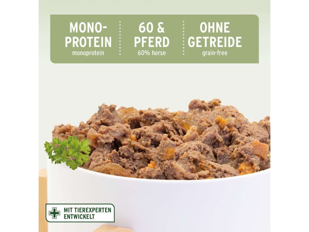 Jedinečné složení výživného koňského masa a lehce stravitelné zeleniny, jako jsou batáty a pastinák, doplněné šťavnatými jablky, hýčká citlivé psí žaludky. Zdravá a zvláště jemná pochoutka - pro psy s citlivým trávicím traktem.