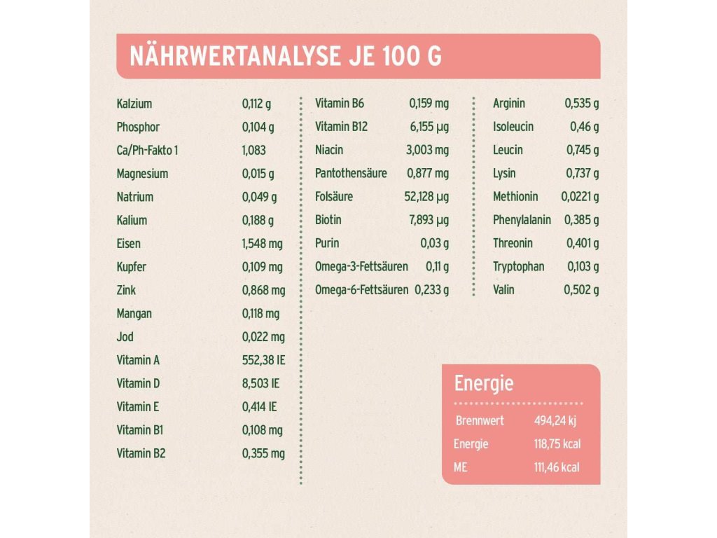 0,1% prášek z vaječných skořápek; 0,1% slávka zelenoústá; 0,1% řepkový olej; 0,1% bylinky (semena ostropestřce mariánského, listy hlohu, ginkgo); 0,1% spirulina, křemelina (1.000 mg/kg)