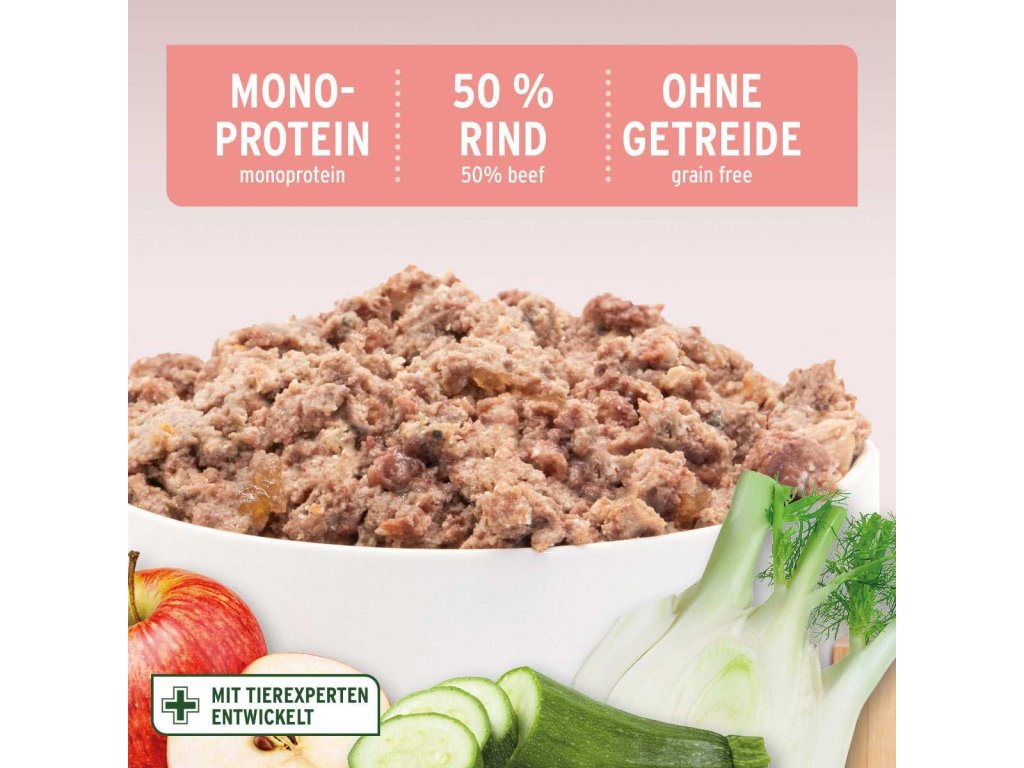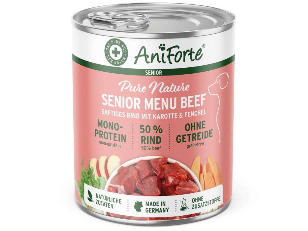 Naše chutná receptura pro psy se speciálními požadavky je ideální pro psy všech plemen, zejména pro starší a staré psy. Mimořádně dobře snášené jídlo je bohaté na omega-3 mastné kyseliny, vitamíny a minerály. U mokrého krmiva AniForte® PureNature také spoléháme na přírodní ingredience, které jsou dokonale přizpůsobeny potřebám vašeho psa. Mokré krmivo AniForte® je vysoce stravitelné a dobře snášené díky typu bílkovin, které obsahuje, a vybrané zelenině a ovoci. Jde o vysoce kvalitní jednoproteinové krmivo v superprémiové kvalitě.