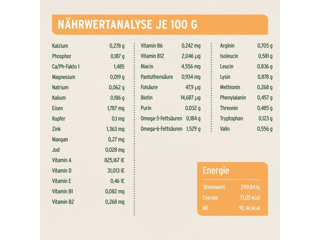 0,1% prášek z vaječných skořápek; 0,1% bylinky (kořen pampelišky, kopřiva); 0,1% olej z bodláčí; 0,1% strouhaný kokos; křemelina (1.000 mg/kg); 0,1% slupky z šípků; 0,1% ječmen