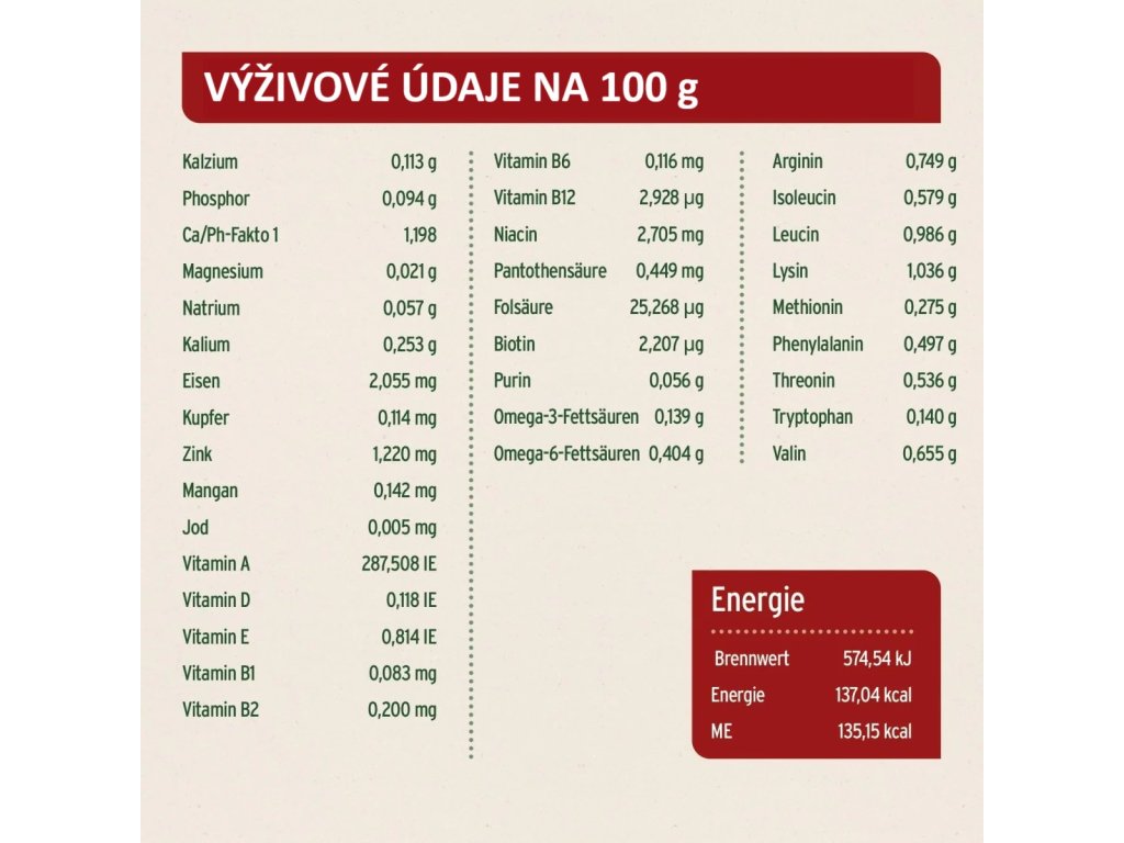 Hrubý protein 14,95%; hrubý tuk 6,07%; hrubý popel 0,43%; hrubá vláknina 0,85%; vlhkost 71,0%