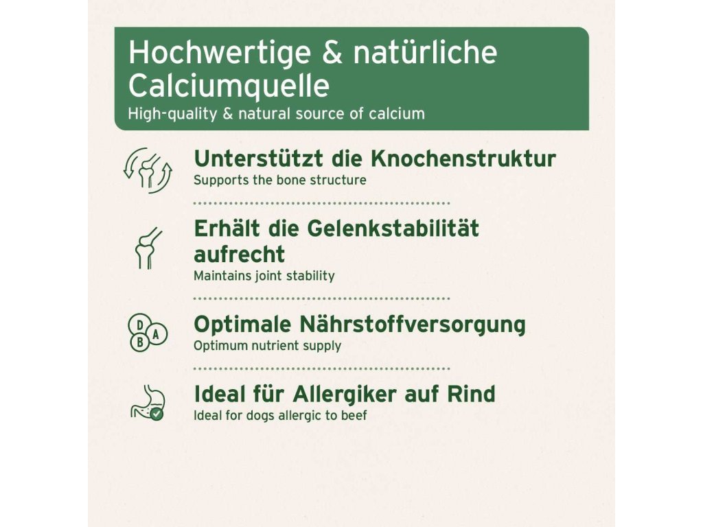 - Obsahuje vysoce kvalitní přírodní vápník. 100% objemu produktu tvoří prášek z mletých koňských kostí pro udržení stability kloubů vašeho mazlíčka.