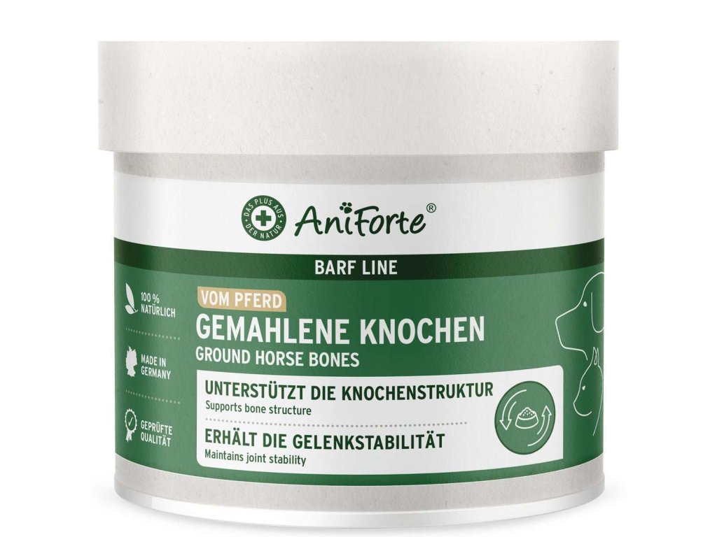 AniForte® BARF-Line Ground Horse Bones je vhodný pro psy a kočky všech věkových kategorií a je cenným doplňkem stravy pro podporu druhově vhodného (syrového) krmení. Vysoce kvalitní přírodní produkt je vyroben z čistých koňských kostí a může pomoci udržet přirozenou strukturu kostí vašeho čtyřnohého miláčka. Vápník obsažený v kostech dokáže udržet zdraví a zpomalit úbytek kostní hmoty.